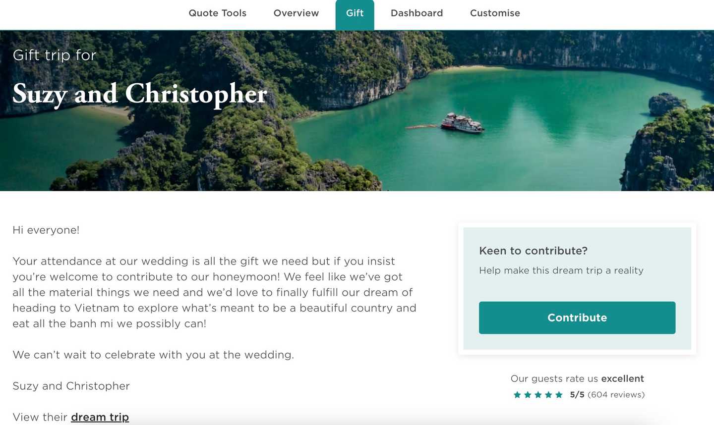 If you’ve got a wedding or a big celebration coming up and have no need for a traditional gift registry, book your dream adventure with Timbuktu and simply send your guests the link so they can contribute towards it. It couldn’t be simpler! If you and your newly betrothed have always wanted to see the Great Migration, or celebrate a significant anniversary with a dreamy beach escape, now you can. You’ll save your friends and family the stress of working out which toaster you really want, and can simply point them in the direction of your travel fund. Here you can see what your gift trip page could look like.