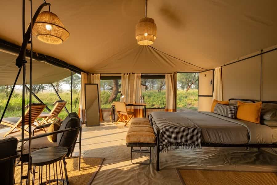 A movable masterpiece of spacious canvas tents filled with Persian rugs and enormous mirrors, Serian’s Serengeti Camp is open for six months only in the south to catch all the action of the birthing season. We say one of the best Serengeti safari camps. Expect exceptional service in camp and even better game drives with guides who know all the wildebeest-watching tricks in the book.