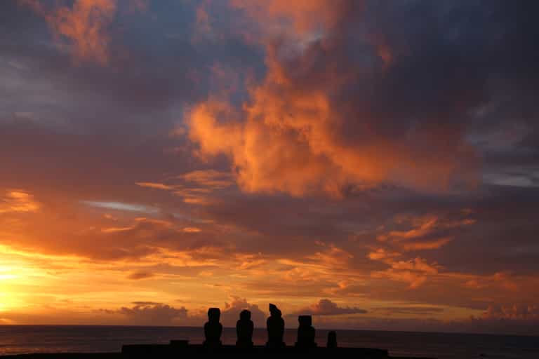 Witness the sun gently dip into the Pacific Ocean, painting a mesmerizing canvas that only Easter Island can offer. This journey begins an hour and a half before dusk, departing from the hotel and heading to the revered ceremonial complex of Ahu Tahai. This archaeological gem, restored in 1974, houses three distinct ahus: Ko Te Riku, boasting restored eyes; the weathered moai of Tahai; and Vai Uri, proudly displaying its five moais. As the sun sets, these ancient sculptures create a captivating silhouette, offering an unmatched backdrop for photos. It's a moment where time stands still, forever etched in memory.