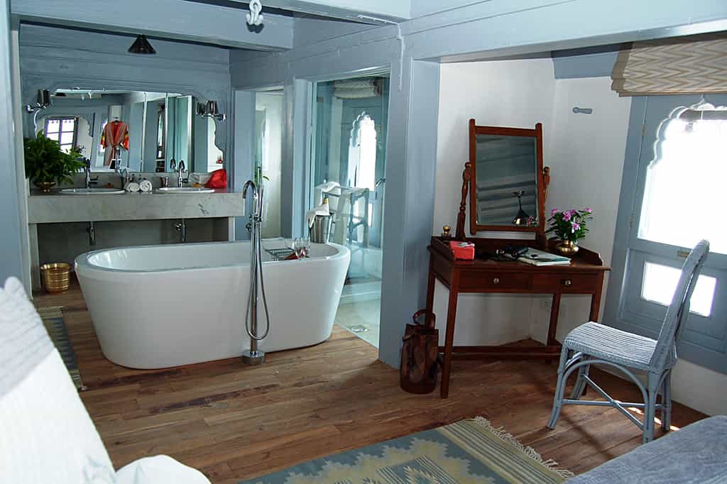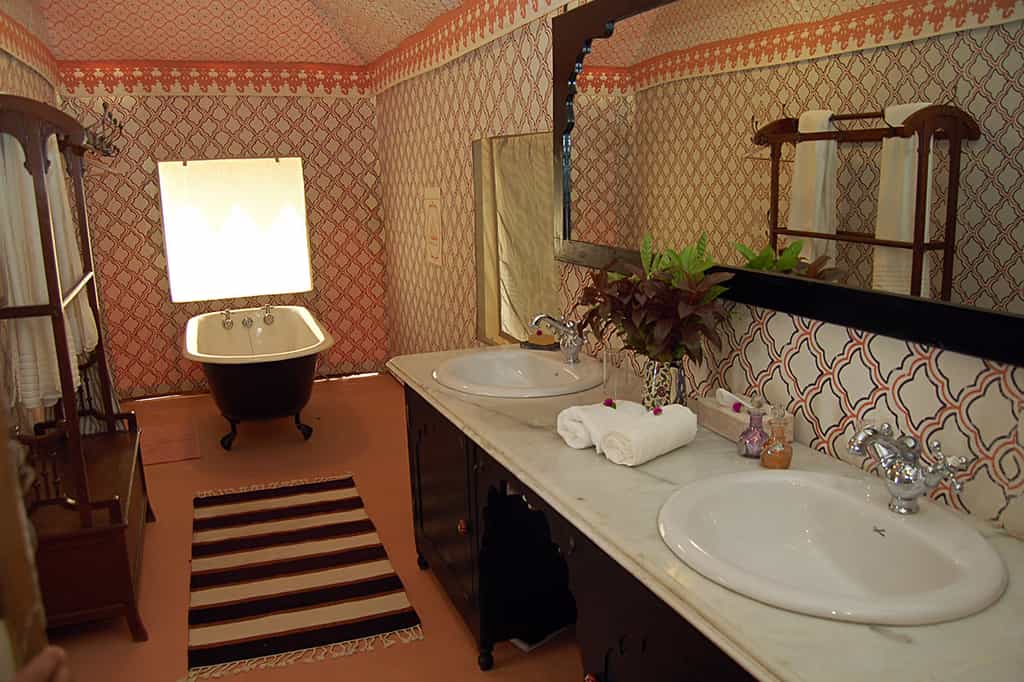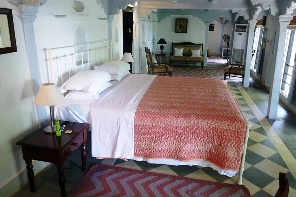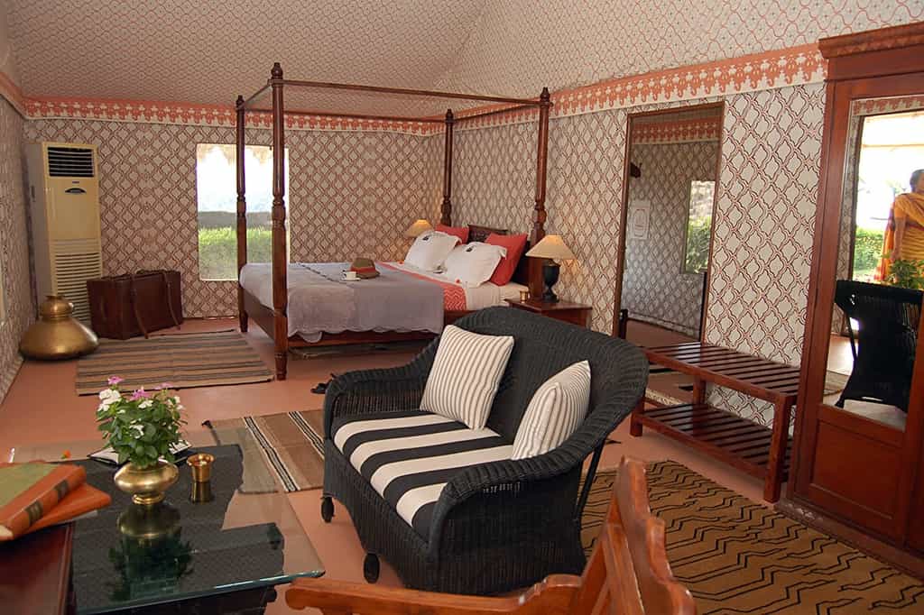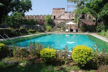 There are 13 rooms and suites dotted across six 18th-century buildings and each is beautifully decorated with hand-picked antiques and intricate fabrics. All have ensuite bathrooms with rain showers, but only some have air-conditioning. There are also two air-cooled tents in the gardens; choose the Royal Arjun, high up in the ramparts and complete with plunge pool, four-poster bed and freestanding bathtub for the ultimate Sheherazade vibes.