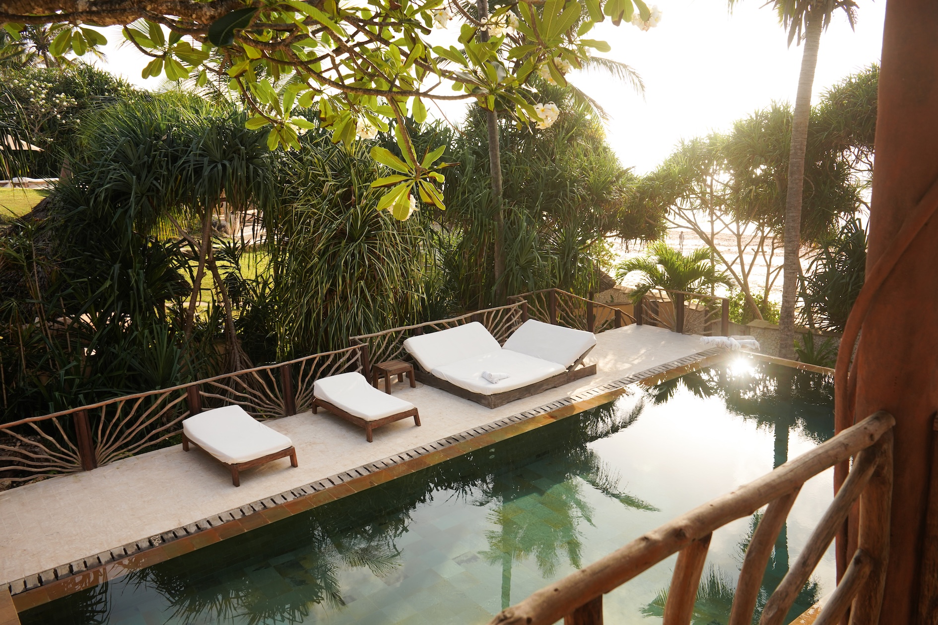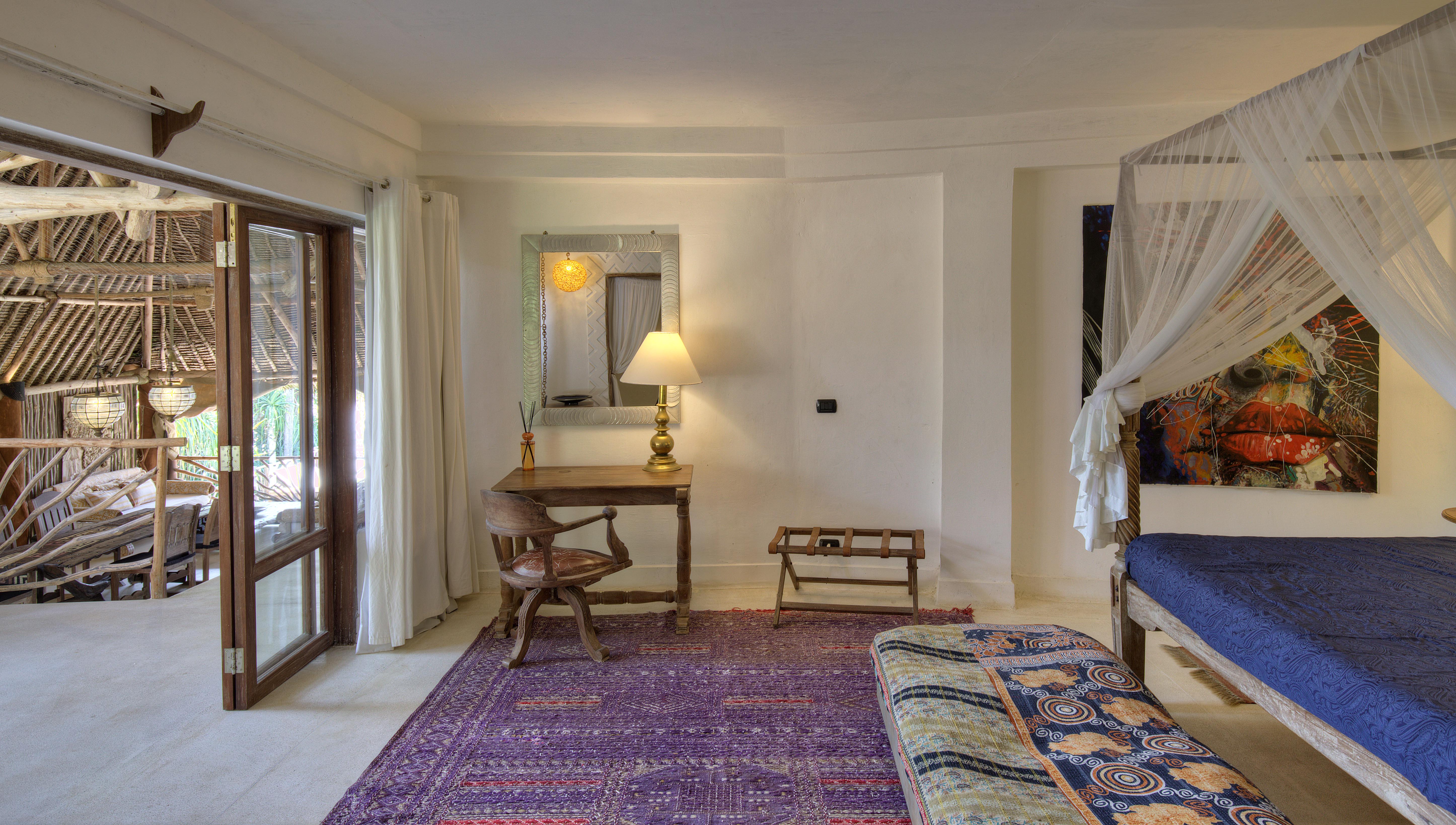 Softly decorated with rich Kenyan textiles and African artifacts each room is very true to its East African roots in style and feel. White washed walls with patterned inserts are offset by wooden shutter windows, exposed beams and cooling stone washed flooring leading out onto individual patios with views over the ocean. Two double rooms can be found downstairs alongside the main dining and lounge area , with two twin rooms upstairs (one without an AC) with expansive views.