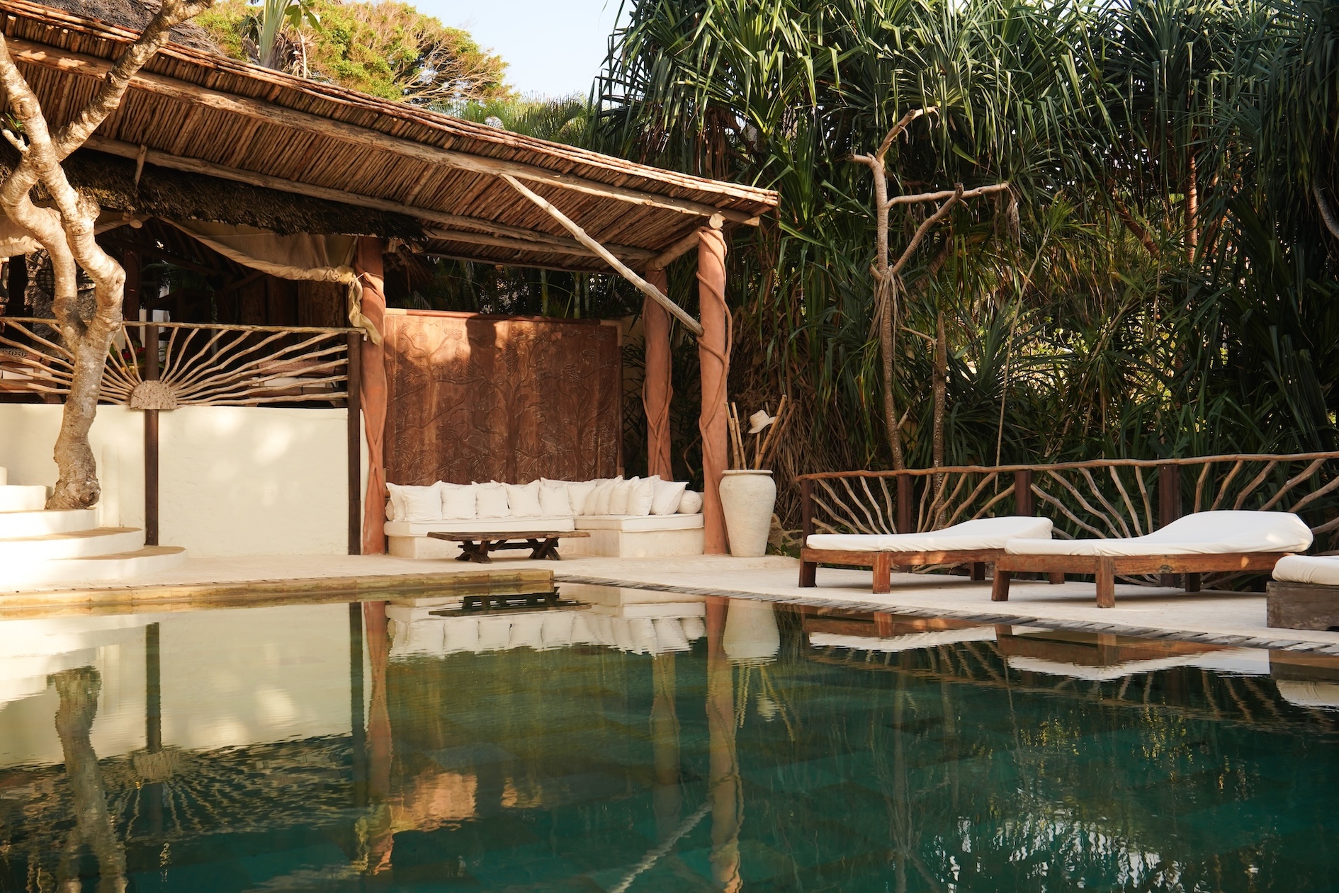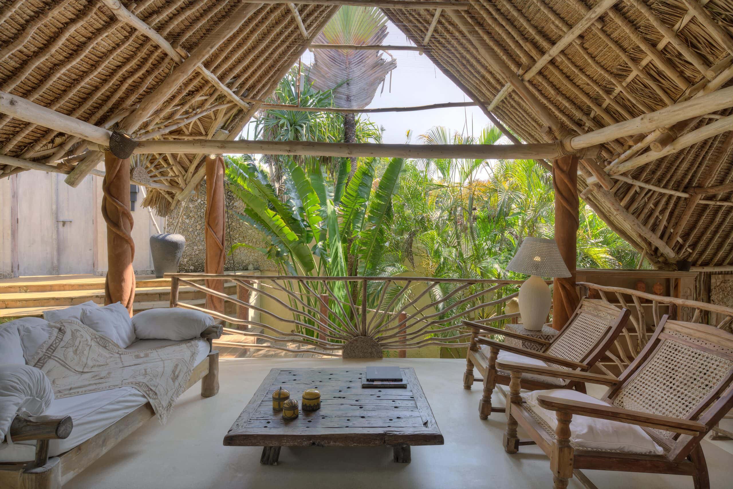 Under the traditional Makuti thatch roofing, amidst twisting tree trunks and hanging textiles the centre of the home opens out to let in the ocean breeze.Plush lounging chairs and a large dining table allows you to dine el fresco. Okra flooring and an impressive collection of delicately placed artifacts from across Africa add light touches to the overall atmosphere of modernity and luxury. A shady garden lined with shrubs and trees encases the large swimming pool that faces out to sea.