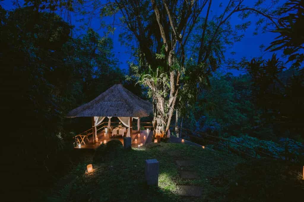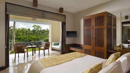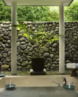 Scattered across the grounds, there are 14 double-storey wood and stone structures, which house the rooms, while the stilted villas are more private. The rooms are all equipped with king-sized beds draped in white linens and cushy duvets, outdoor bathrooms, and balconies with views of the river valley below. The Ayung River Villas are a particular favourite with their wrap-around decks perched over the gorge, and huge bathtubs that sink into the lotus ponds. Some villas also have their own pool.