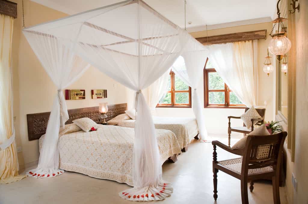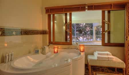 The award winning Sails Restaurant and bar is the focal point of Almanara – a unique architectural mix of steel girders and canvas sails designed to capture the essence of East African coastal living. In the palm-fringed gardens is a beautiful lagoon-style swimming pool and sun deck, with a jacuzzi and sunken cocktail bar: a perfect spot to relax during the heat of the day, before heading up to the elegant rooftop terrace for sundowners overlooking the distant Shimba Hills National Reserve.
