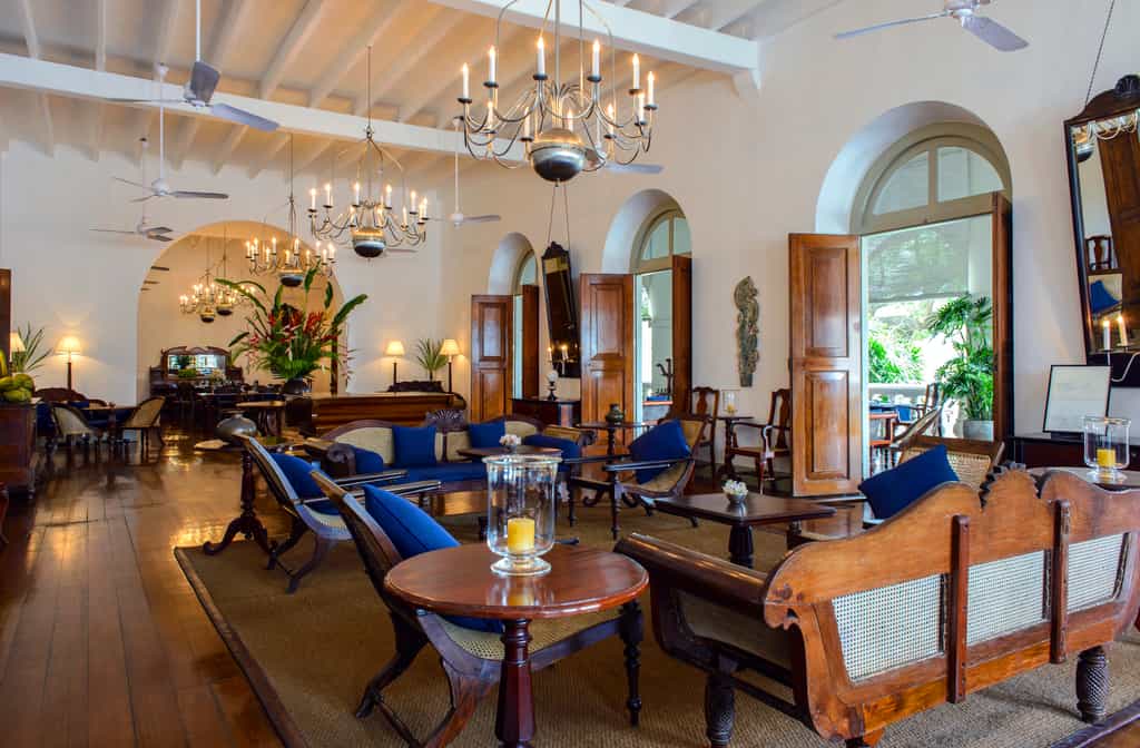 Surrounded by palms with kingfishers flitting overhead, the pool is large with private cabanas to relax in. Amangalla also has a stylish spa with a range of Ayurvedic treatments and hydrotherapy suites complete with hot and cold plunge pools. Enjoy afternoon tea on the verandah with views of the historic Church Street or sip cocktails on the Sunset Balcony. Decorated with antique furnishings and chandeliers, the dining hall serves local favourites and international fare as jazz pianists fill the room with music.