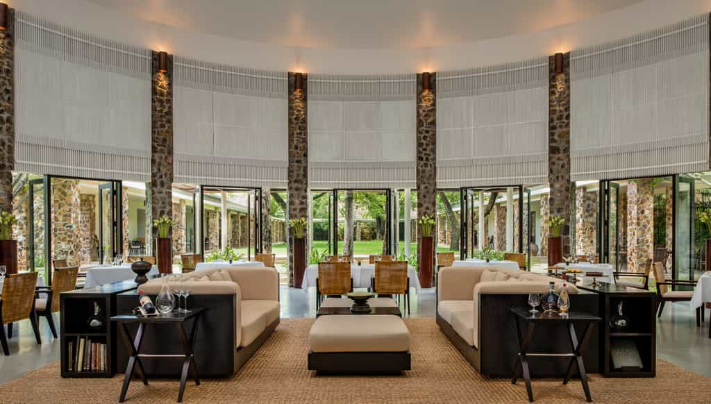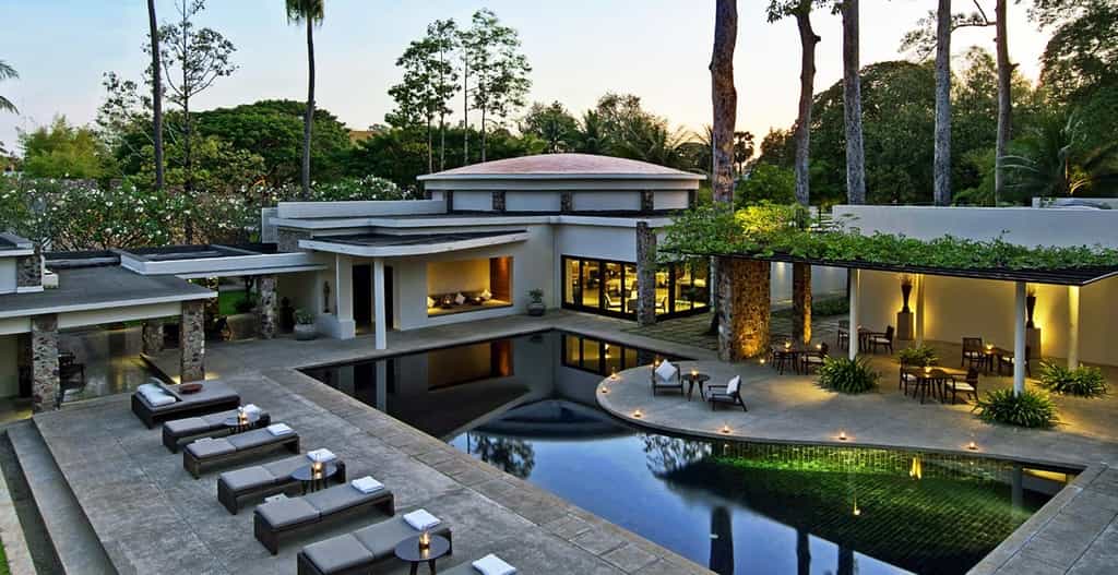 Sheltered by walls of greenery, Amansara is mod and stylish with rustic stone columns and sandstone patios. Lined by loungers, the pool is rather inviting and there's a smaller lap pool for even more privacy. Once a vibrant dance hall, the circular dining room (and bar) is a minimalist dream with linen-topped tables, a plush lounge and glass doors flung open to let in the garden air. Tuck into well-chosen Khmer and western dishes - the Australian beef with a Kampot peppercorn is divine! Sunrise yoga can be enjoyed at the open-air studio or on the rooftop for the best views.