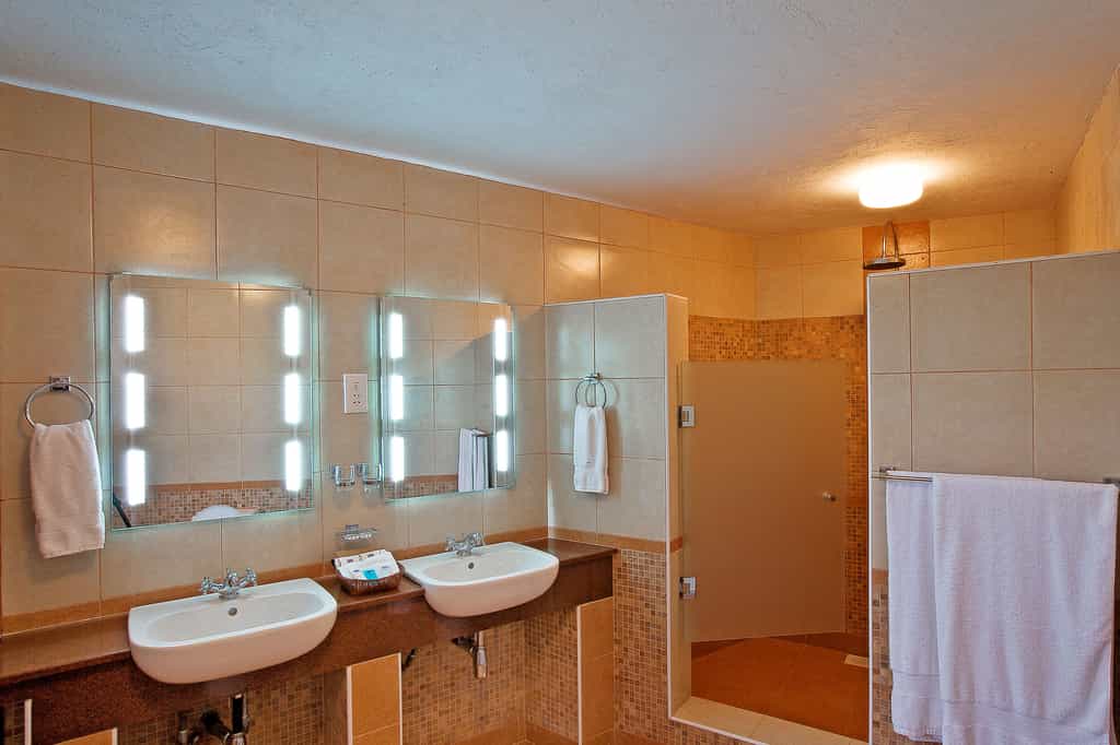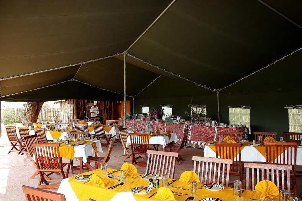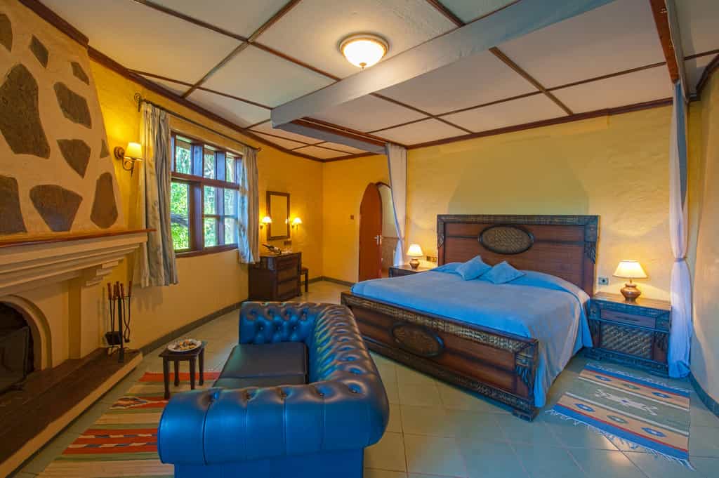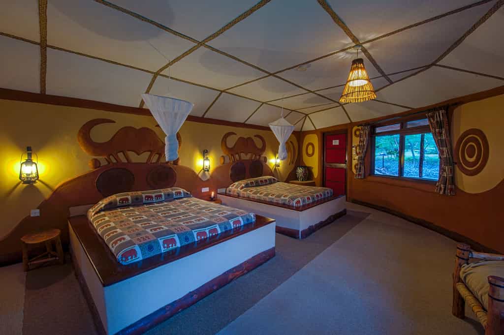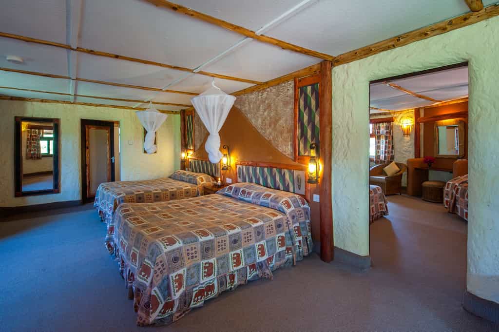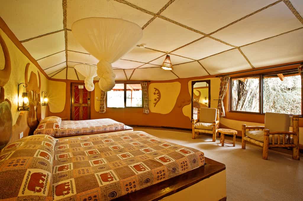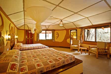 Based on traditional, African-style rondawels, each of the 83 rooms scattered across the expansive property gardens are rustic in style: thatched roofs with high, plastered ceilings and small verandahs behind ochre, mud-textured walls. The furniture and fittings are slightly dated with loud, African motifs and Kenyan decorative materials, but there is an overall presence of comfort. Most rooms are en-suite with one or two queen-sized beds, and six of them have interconnecting doors for families.