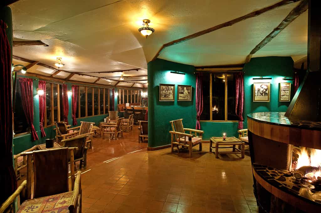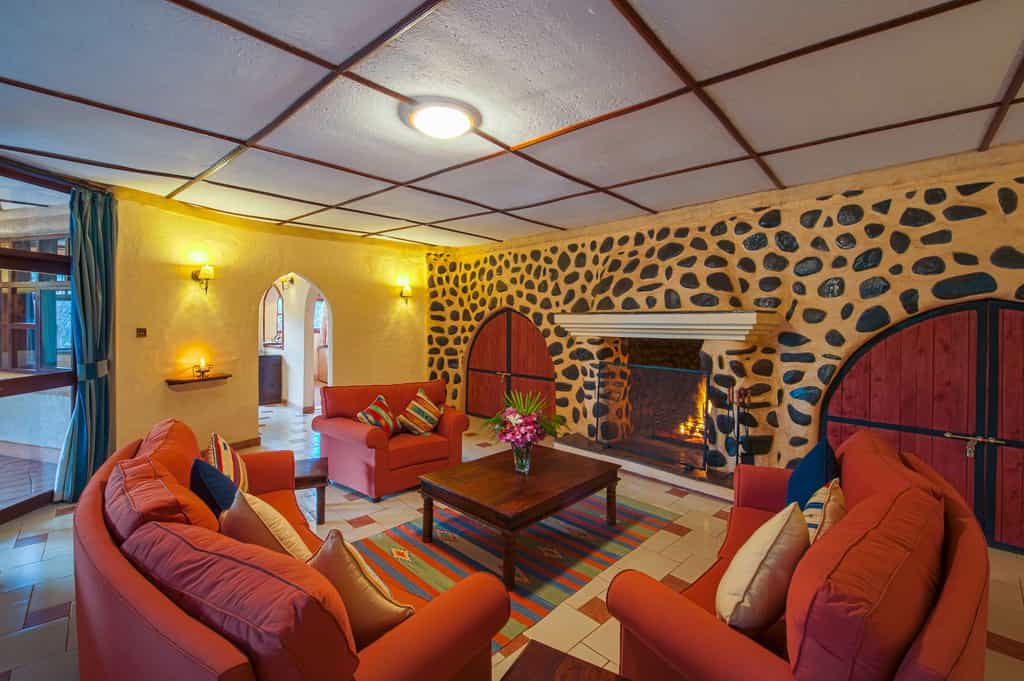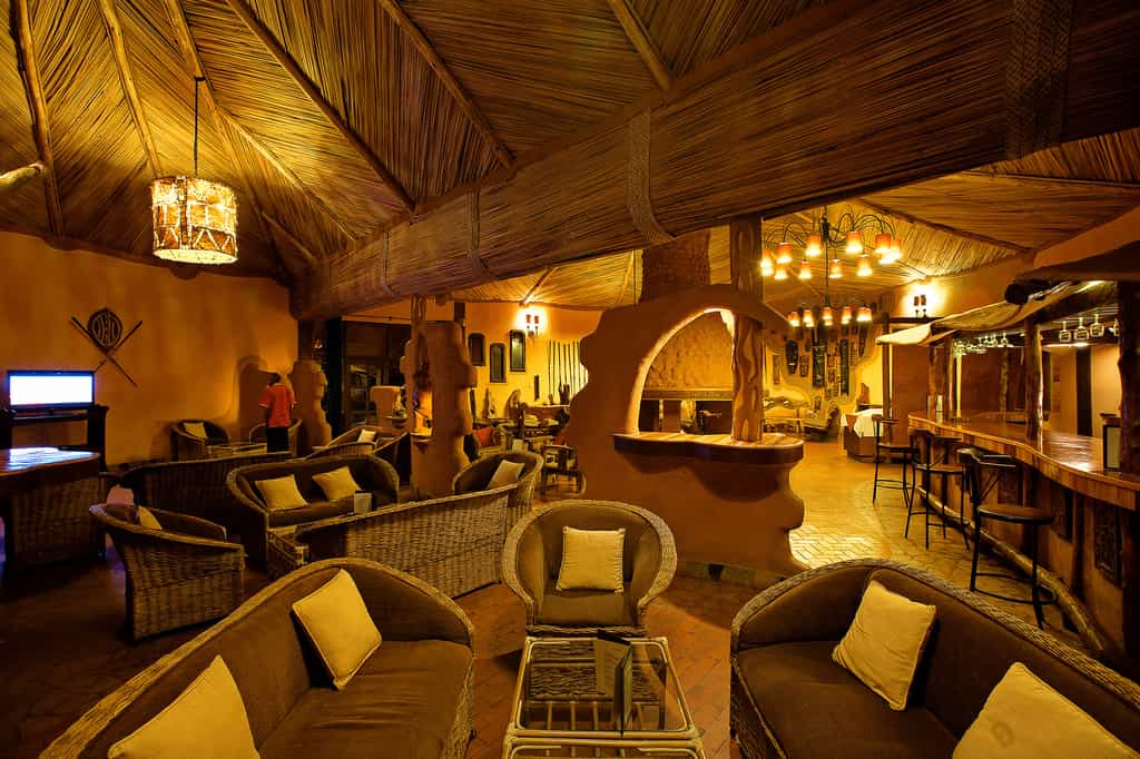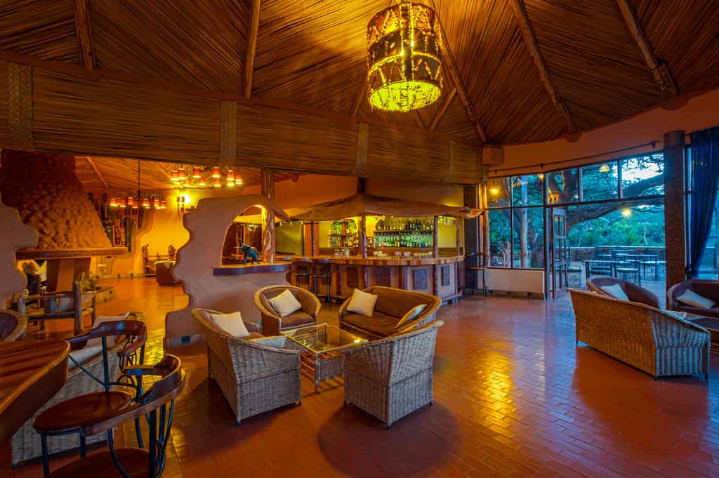 There is something quirky and endearing about the curved, ochre walls and high bamboo slatted ceilings that characterise the lodge's reception and lounge area. They are open and spacious, with large windows overlooking the gardens. African geometric motifs adorn the walls, while natural browns, burnt oranges and creams combine with scattered calabashes and rough timber furniture. A bridge takes you to the main dining house, designed in the theme of a traditional Maasai House, and the character-filled Mawenzi bar beyond.