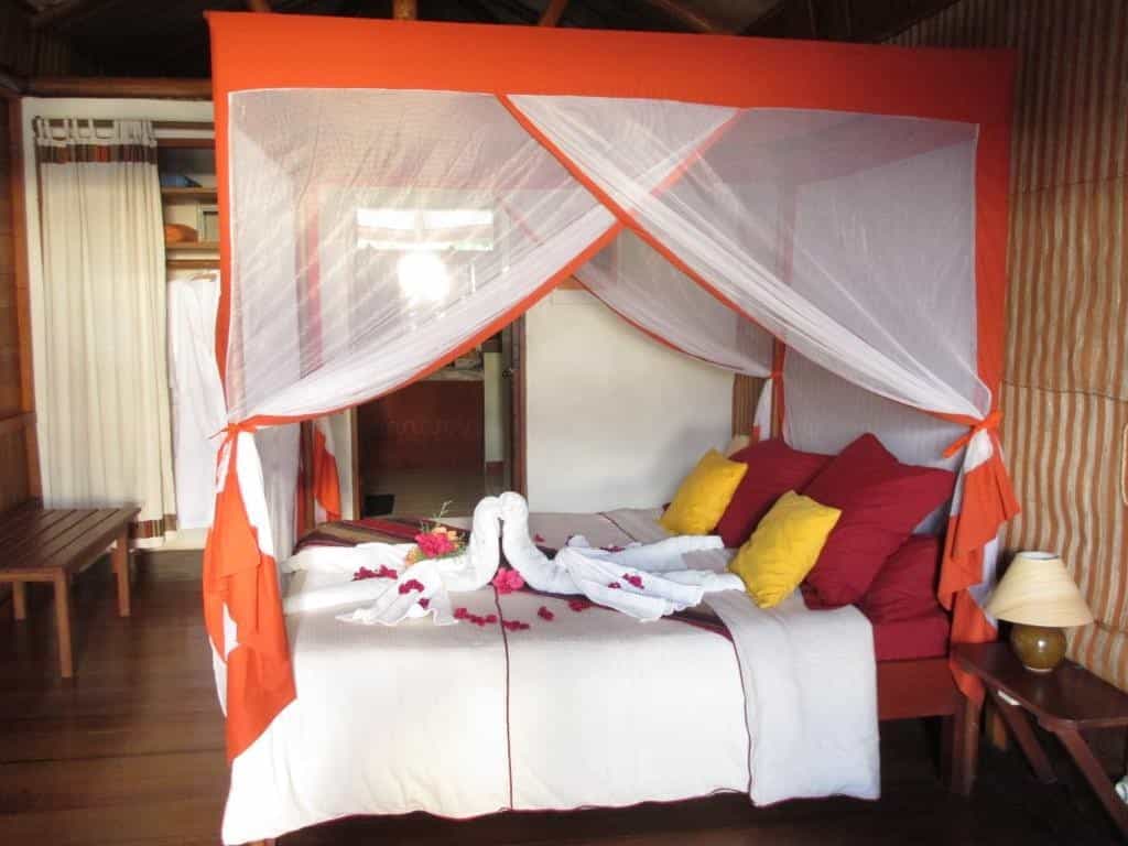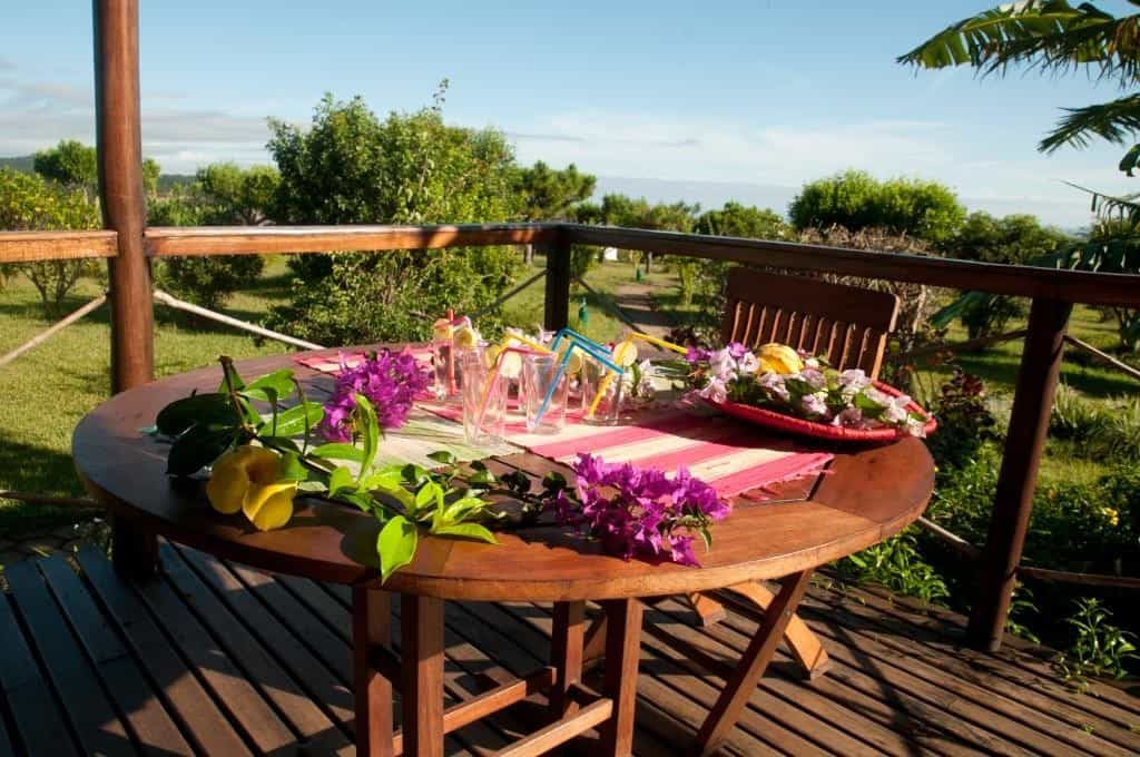 Winding pathways lead from the main area through the garden to 12 spacious, thatched wooden bungalows, spaced well apart for privacy. Each has an en-suite bathroom, and plenty of space for an extra bed or two for families, if required. The furnishings are simple and comfortable, with mosquito nets, warm natural colours throughout, and an elevated private outdoor timber deck facing the Ambre Mountain Forest or the Bay of Diego in the distance.