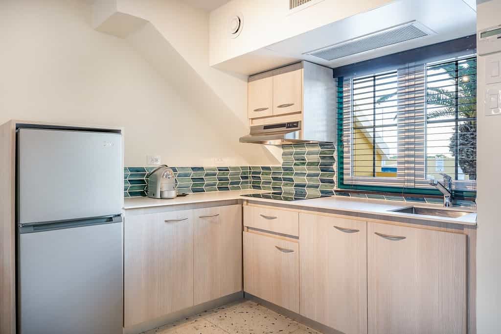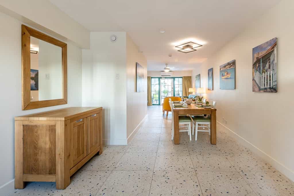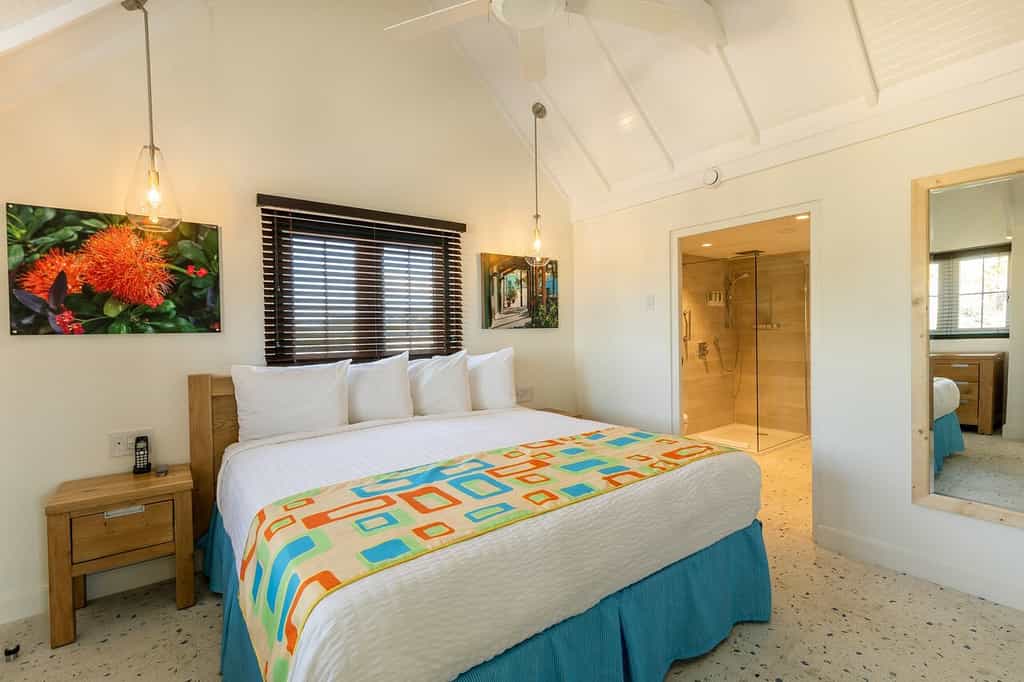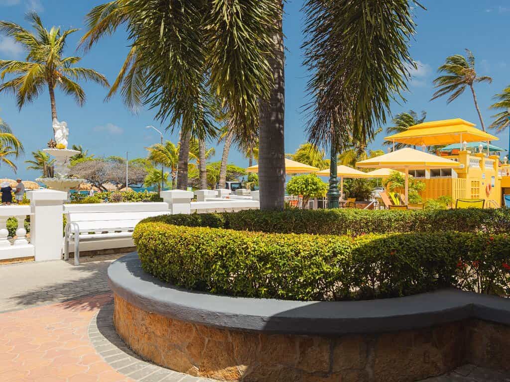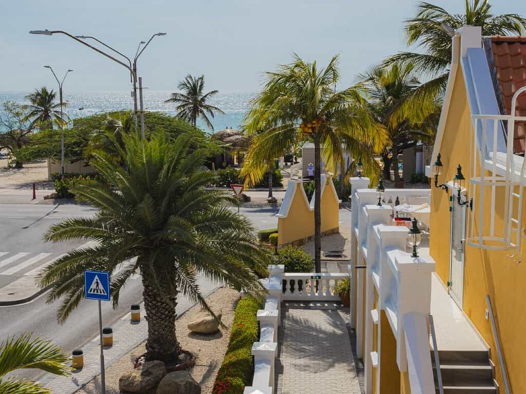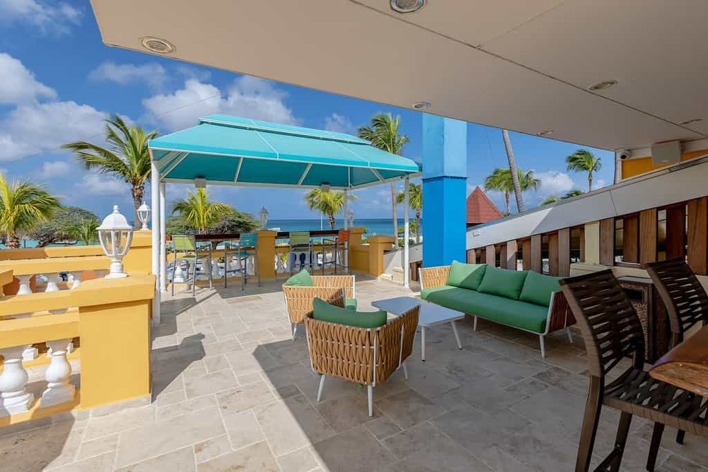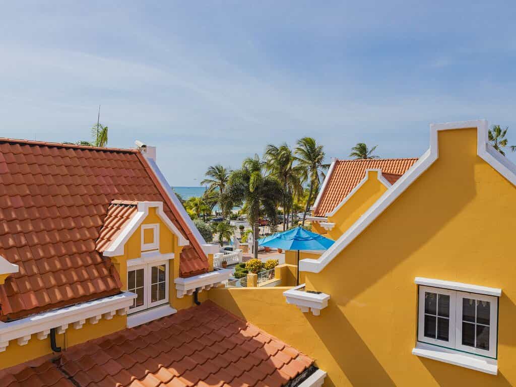 The hotel offers 72 rooms that beautifully blend modernity with the Dutch-style architecture. The interiors feature vibrant sunflower-hued textures and local art pieces, A-frame ceilings, and white-painted wooden beams. Furniture in earthy shades, rich, dark brown doors, and expansive tiled floors add a touch of elegance to the rooms. The warm, tropical vibe is enhanced by live plants placed throughout the space.