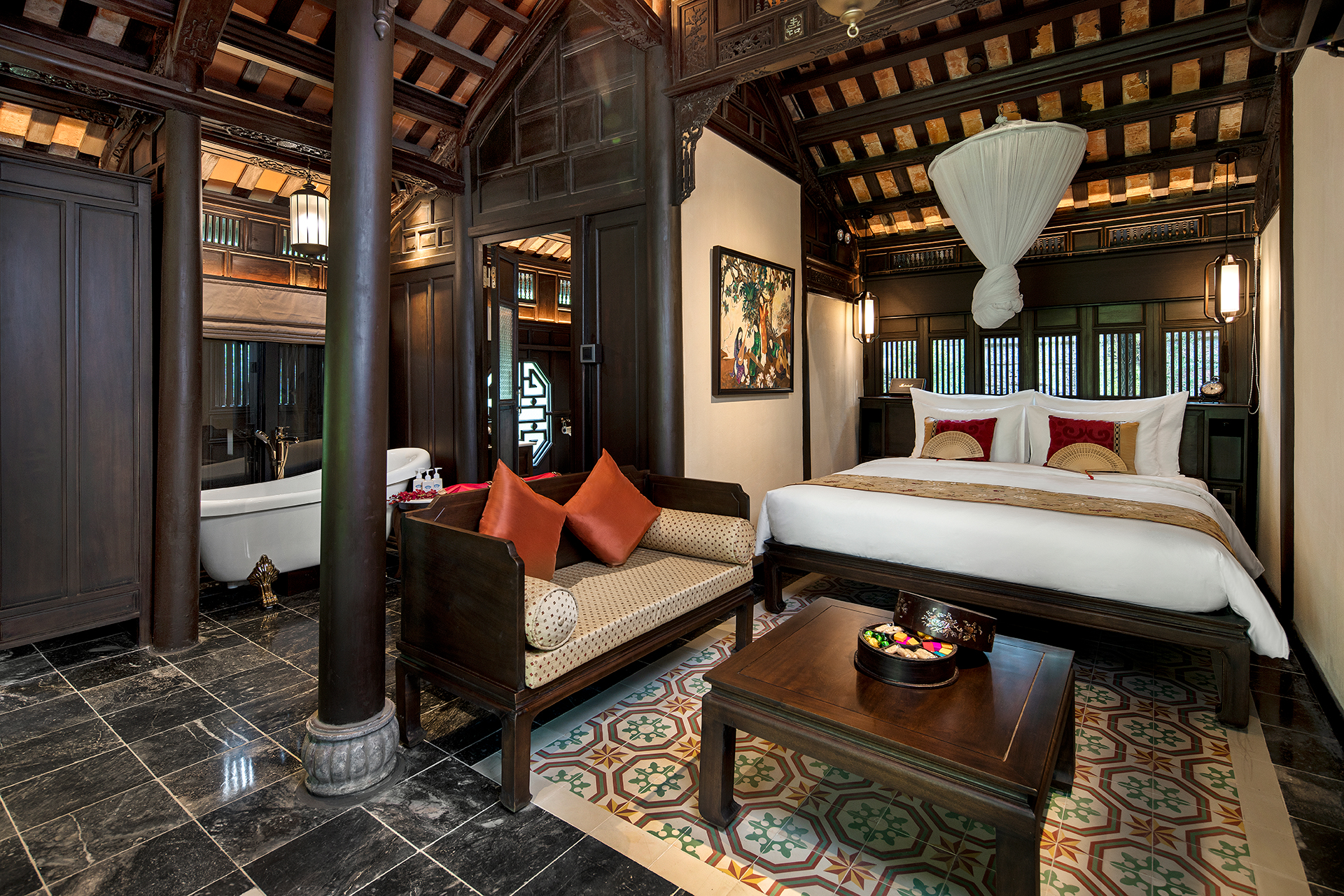 In total, the ancient wooden houses have eight rooms, all of which are authentic mimics of bygone Hue. Each room has a King-sized bed draped in silk, striking decor that illustrate the theme (from royal dress to paintings of characters from Hue's greatest poetry), and a large bathroom - some even with a Jacuzzi. The rooms were all influenced by Feng Shui, evoking a pleasing sense of harmony. A number of rooms have a kitchen and dining area for added privacy and each has a terrace.