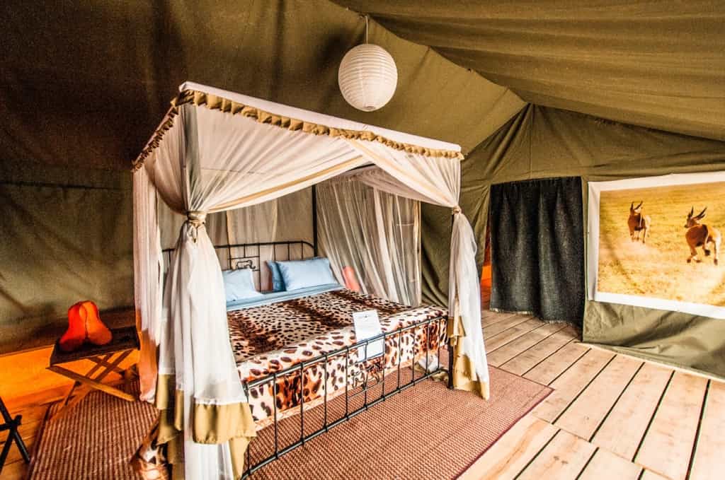 A canvas lounge in the centre of camp serves as the gathering point between activities. With mesh sides that enable you to keep an eye on the action from the comfort of one of several plush sofas, it also offers a small bar and tea and coffee station, and plugs for charging electronic devices. Simple, well-prepared meals are served in the dining tent.