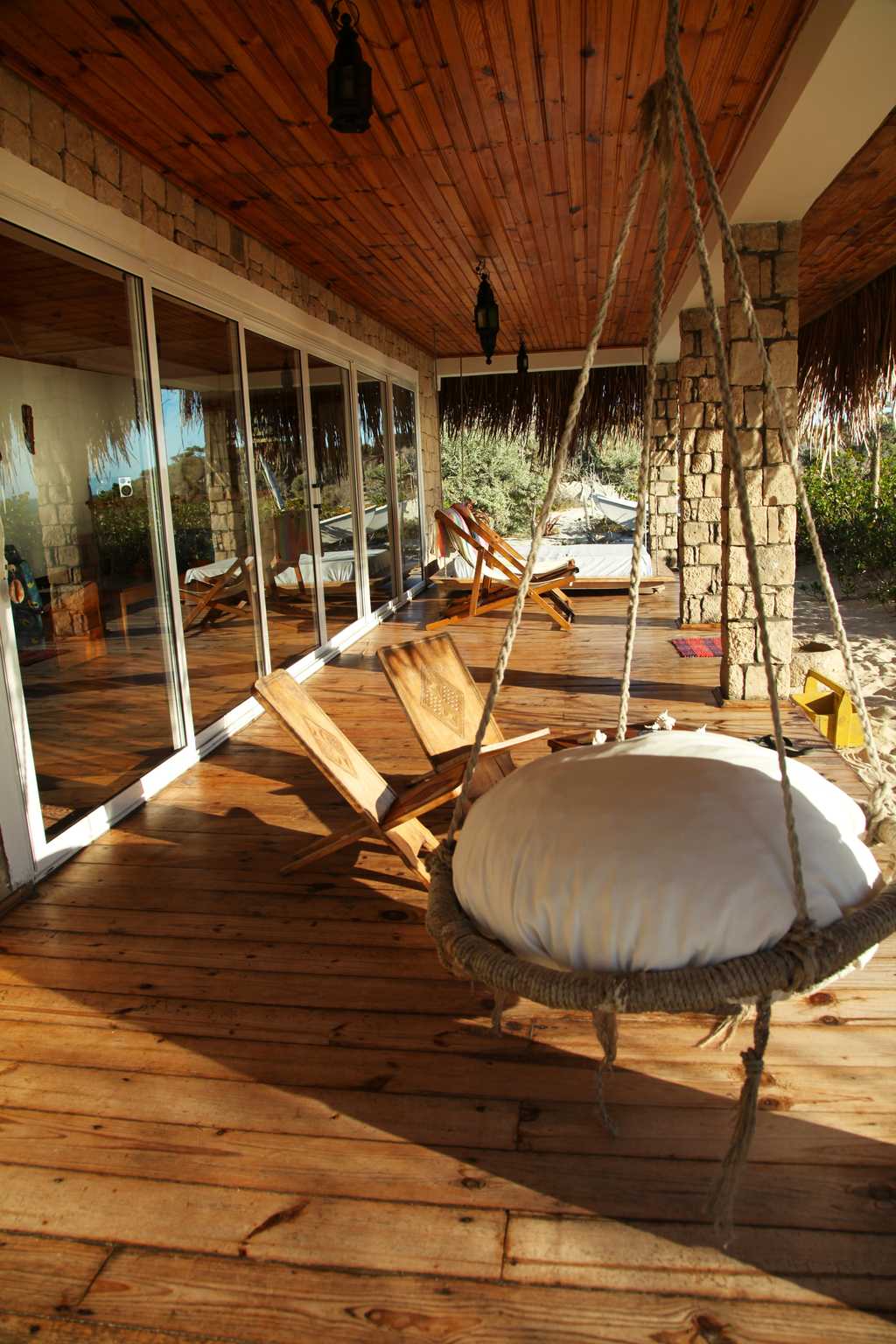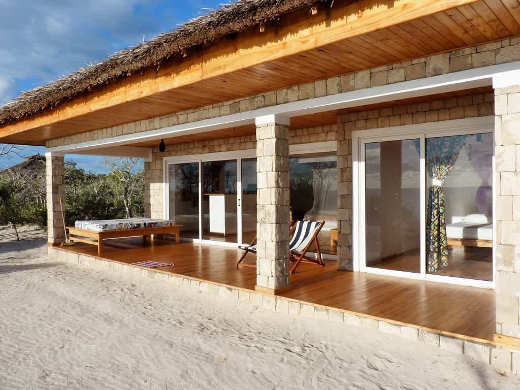 The nine beach bungalows are substantial, yet don't seem out of place in this easy, breezy environment. Natural materials have been used throughout – white stone walls, wooden floors and thatched roofs. Outside each, a sheltered veranda is furnished with a lovely suspended daybed and a few chairs. Inside are two bedrooms – a master with a king-sized bed, and a smaller room with two/three single beds, all with mosquito nets. Bathrooms are shared, with double sinks and large showers.