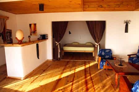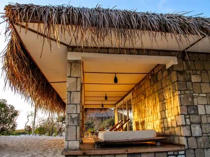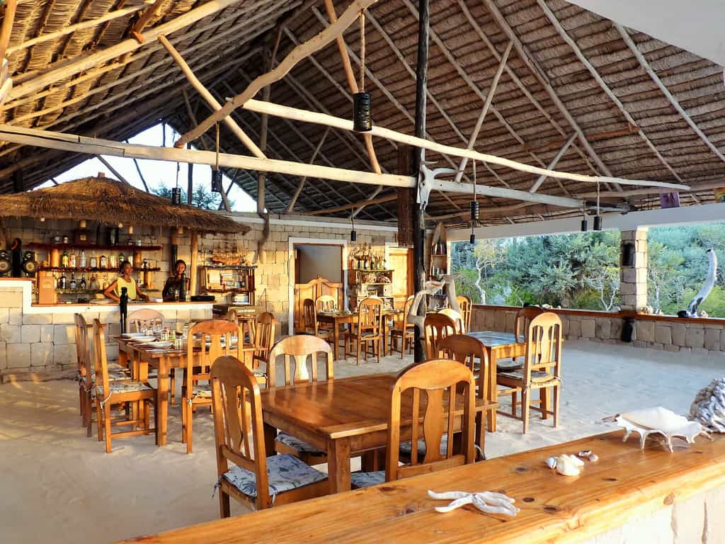 Tucked into the coastal forests, the lodge's restaurant faces the endless horizon. Its thatched roof, sand floors and stone pillars make it little more than a shelter from the elements, but don't be deceived – everything you could possibly need is here. There's a small bar that serves frosty brews, and a cosy cushioned lounge. Individual tables are set uniformly throughout and scattered shells decorate the perimeter.