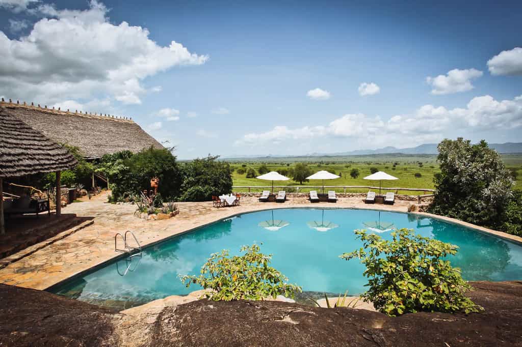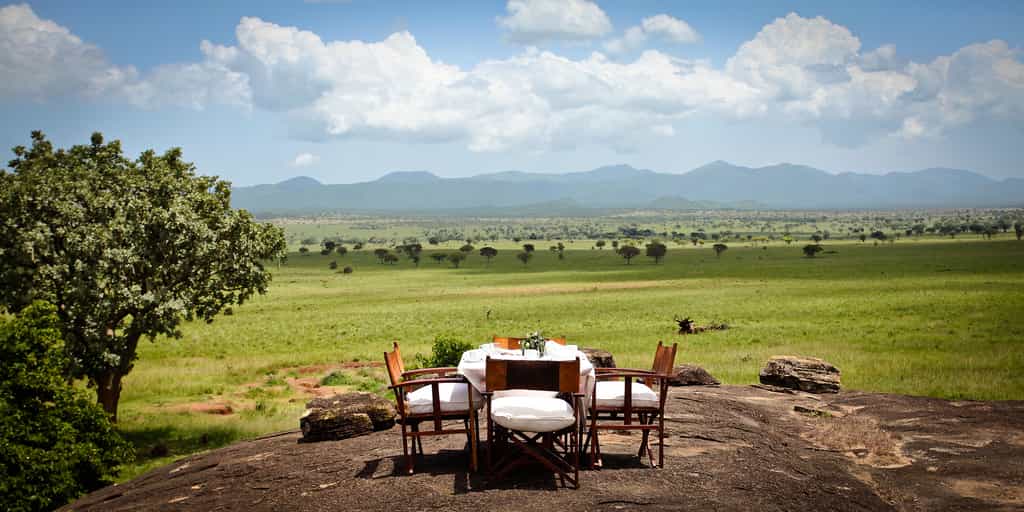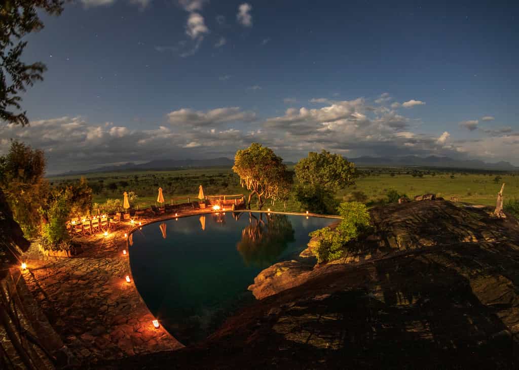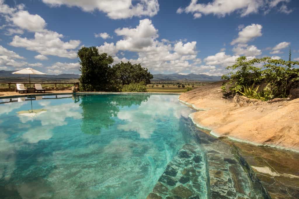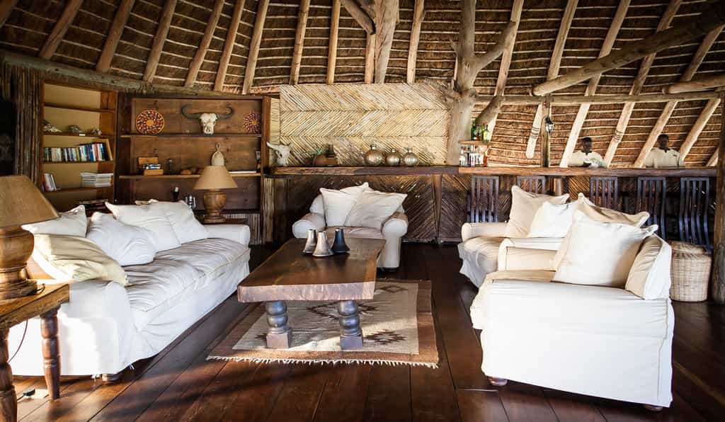 From its commanding position on the slops of a rocky kopje, the main lounge and dining area has incredible views over the horizon-bending landscape. Stuffed with low-slung armchairs and chunky wooden tables, the open-sided building is spacious and breezy with plenty of shady spots to hide away in. Down a few steps is the rock-carved swimming pool; flop on a lounger and spend a lazy afternoon watching the wildlife at the waterhole below, before dinner is served at the grand, white-clothed table.
