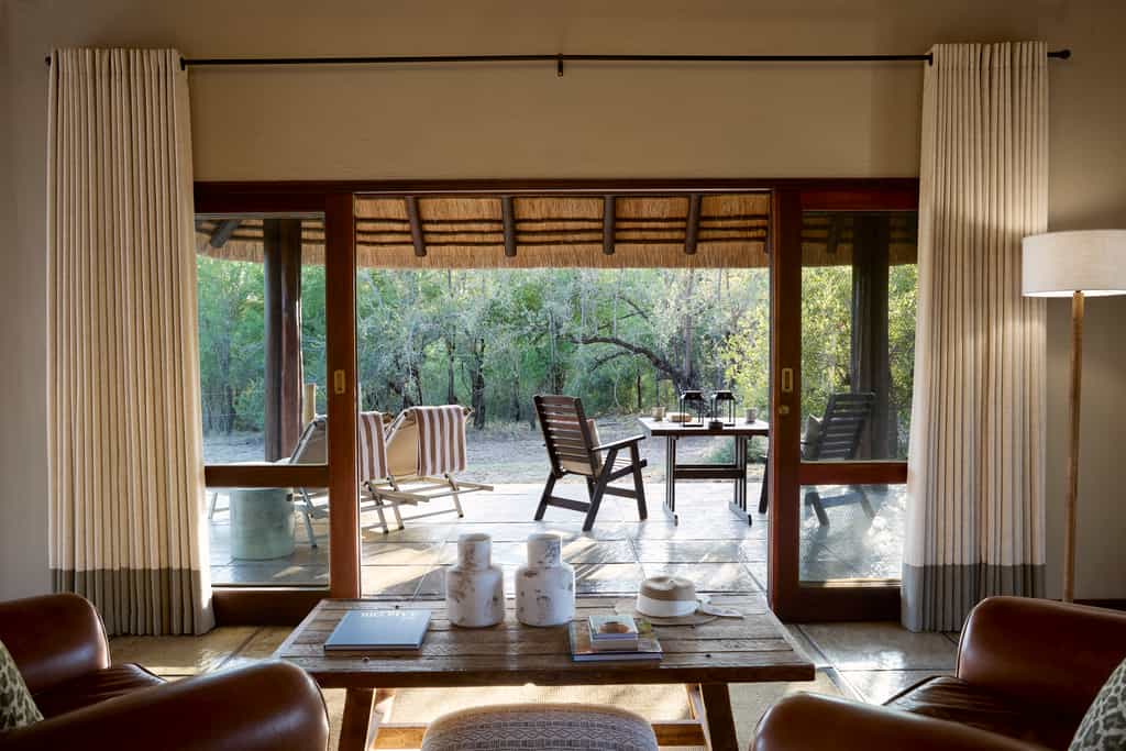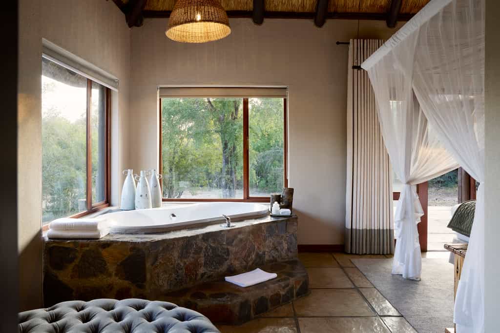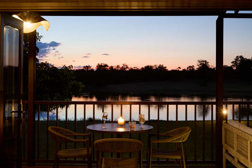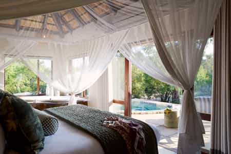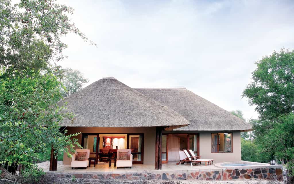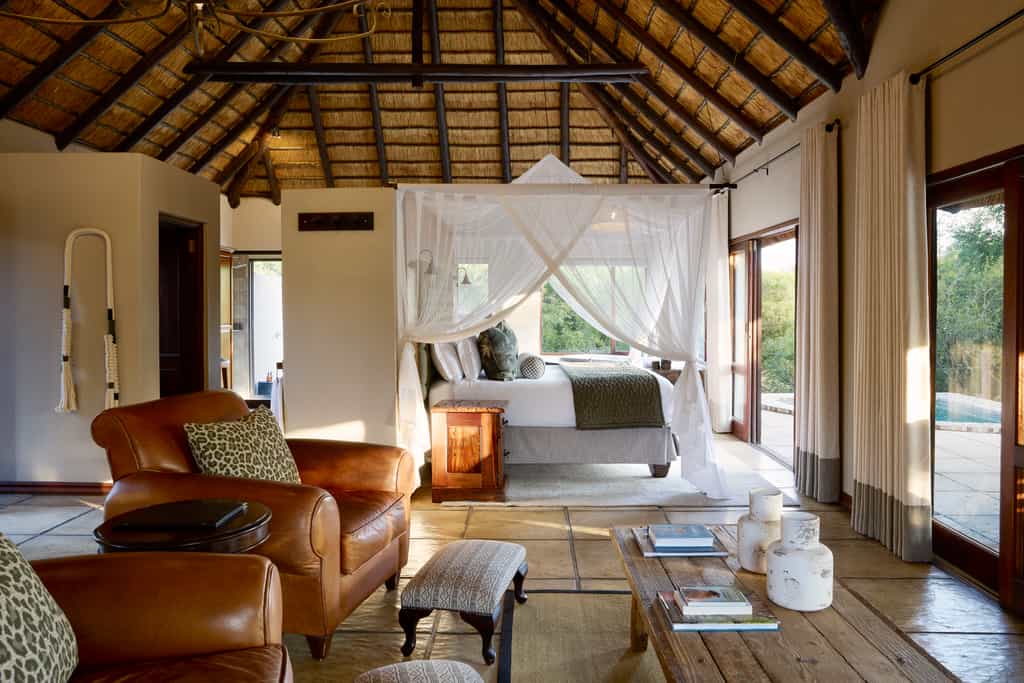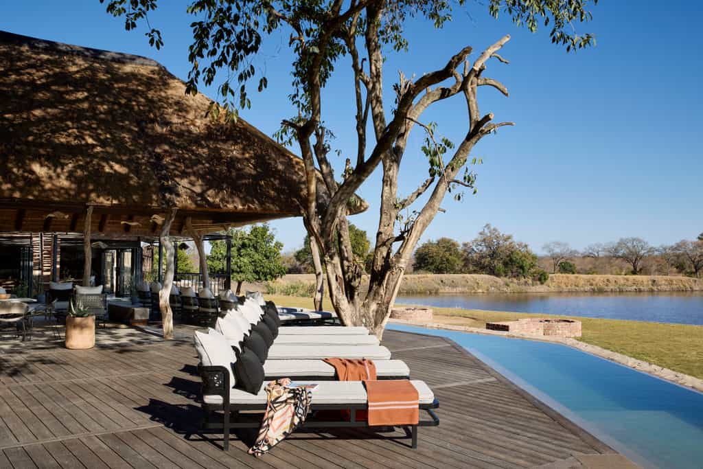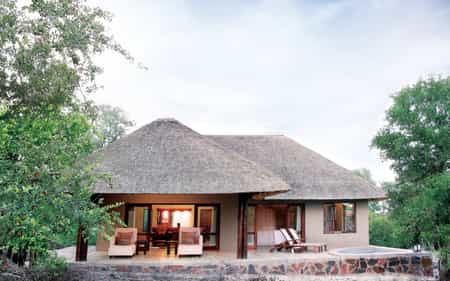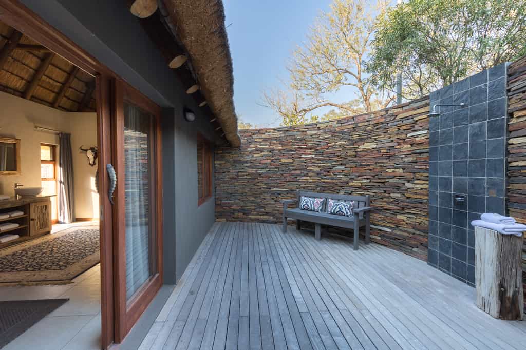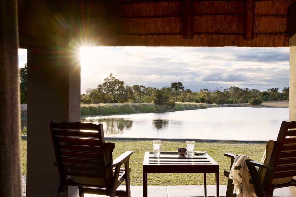 Seven humble, thatched bungalows are positioned around the waterhole. They offer old fashioned comforts and warm tones. Each features a shower-over-bath, as well as an outdoor shower. Four of the eight luxury rooms face the water, while four are hidden in the woodlands beyond for a more secluded feel. The luxury rooms have private patios, lounges and plunge pools.