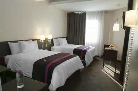 Spacious rooms with furniture that combines neutral tones and violet accents in the details, giving a touch of color to the impeccable and comforting white beds, adorned with bedspreads hand-woven by Cusco artisans.