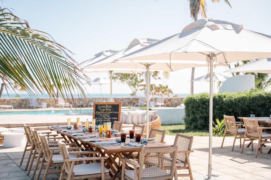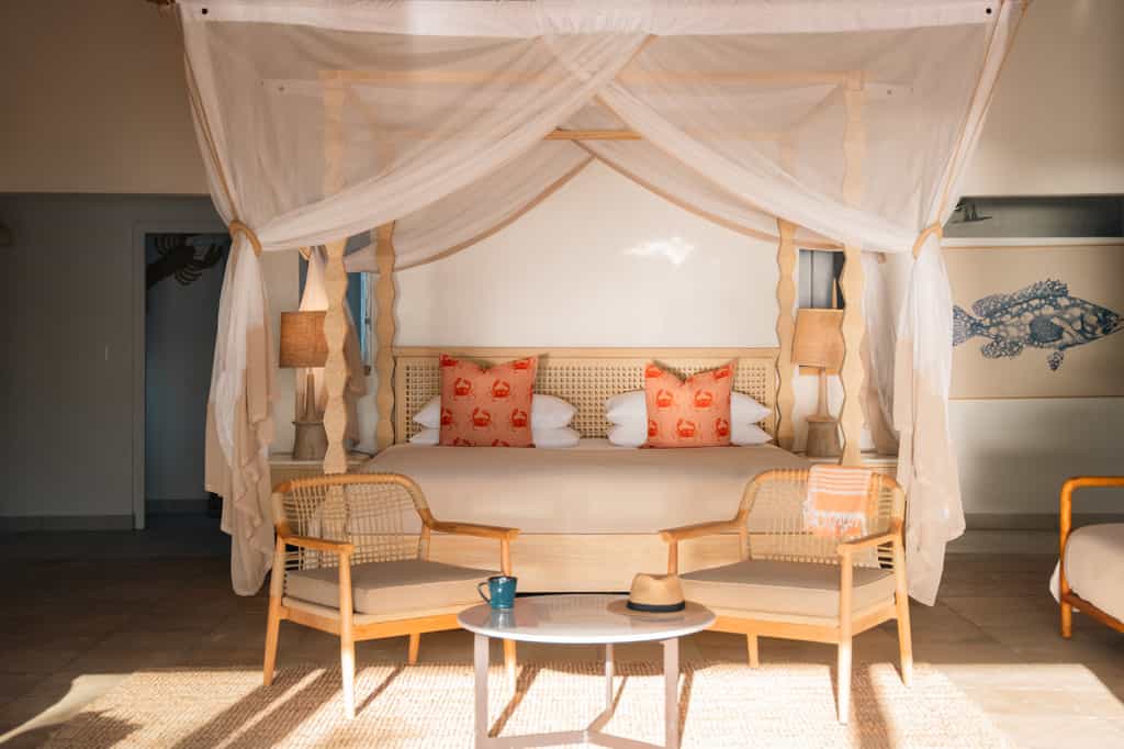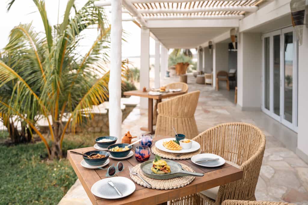Azura has 10 private villas, which are decorated in pops of bright blue, shabby-chic wooden furnishings and woven rugs. Each comes with a canopied king-size bed (or twin beds), air con, mini bar and spacious deck with a comfortable sitting area and outdoor shower. The grandest is Villa Vista, which is ideal for families with 2 en-suite bathrooms, an indoor entertainment area with a bar and a lovely private pool. Down on the beach, each villa also has a rustic sala to soak up the views!