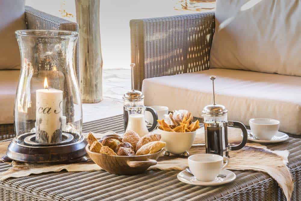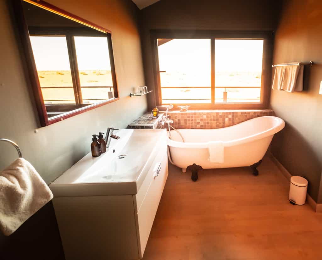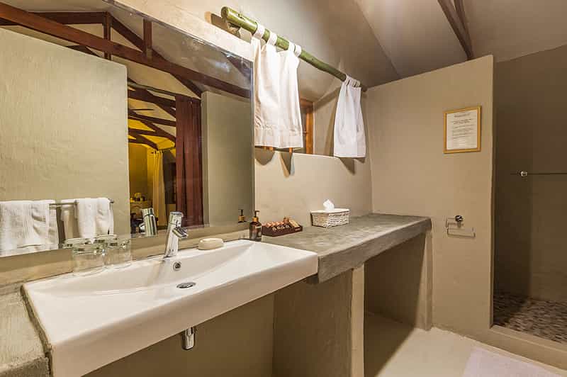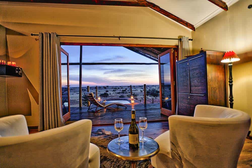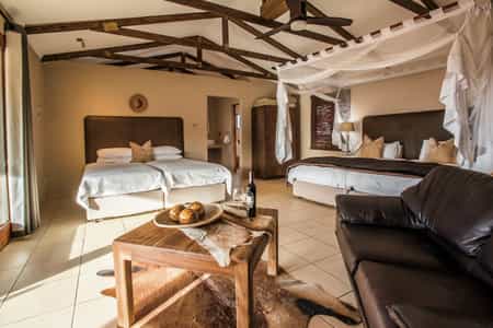 The four dune chalets are set on stilts on a sand ridge, with views of the desert and its plentiful game. There's other accommodation too – two exclusive chalets with private splash pools, 10 savanna chalets in a street between the dunes, and four rooms beside the main lodge. All are spacious and well designed, with huge mosquito-netted beds, en-suite bathrooms, aircon, fan and comfortable chairs. Most have mini-bar/fridges.
