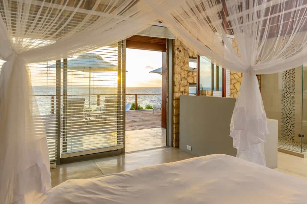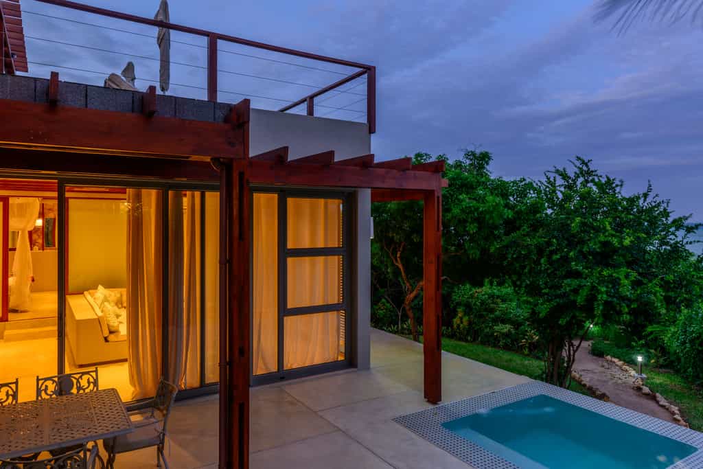 Twelve rooms are clustered into four, free-standing units built sloping down towards the oceanside along a leafy ridge, one of which is a full family unit. All rooms are modern and simply styled, with exposed brick work and light, airy decor touches that do not overpower the senses. Upper floors have expansive outdoor areas with seas views and loungers, while lower levels have private splash pools and full kitchenettes. The Presidential suite has all the bells and whistles with more privacy.
