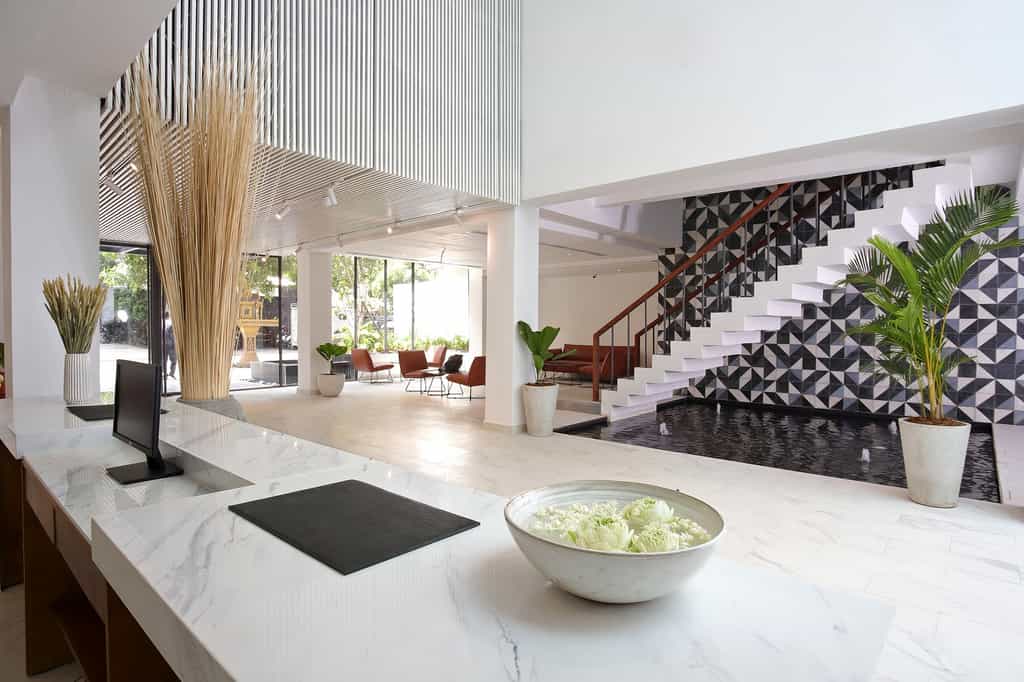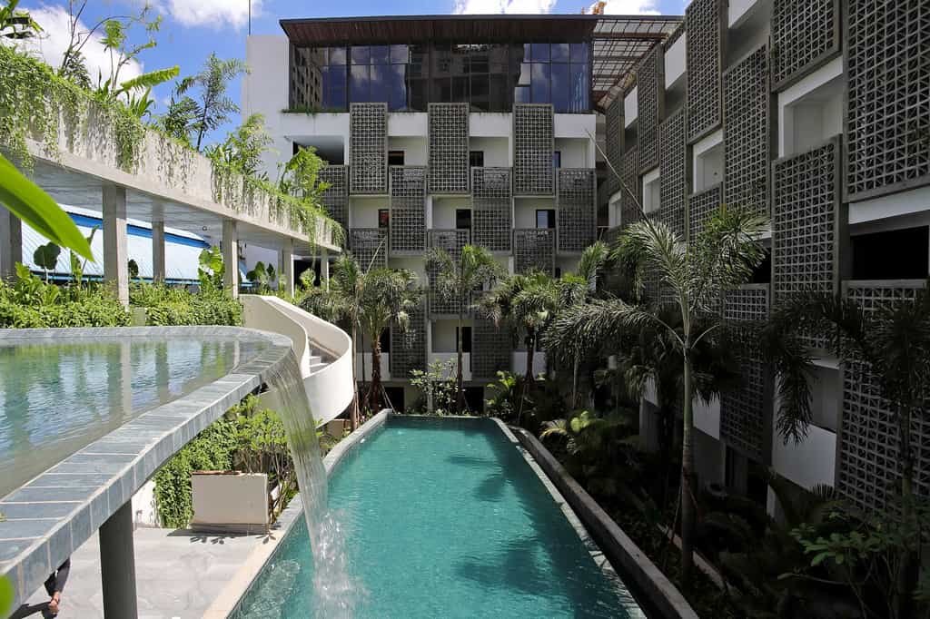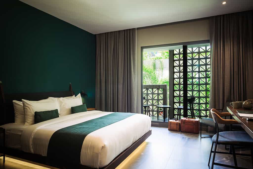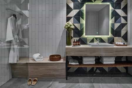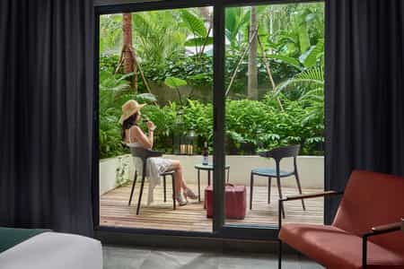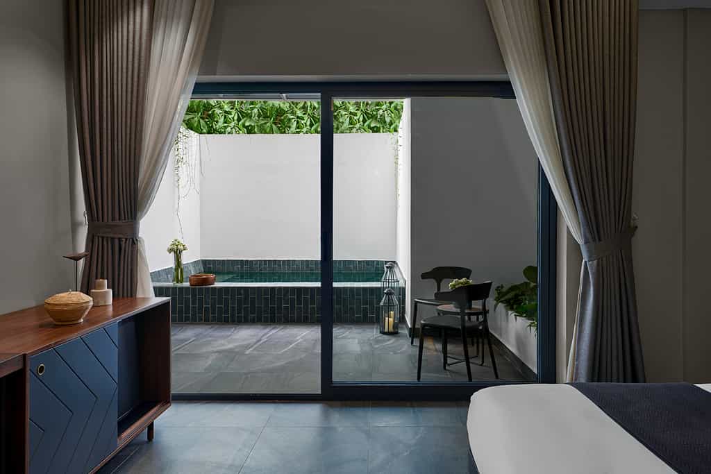 There are 106 rooms and suites split into 10 categories, each slick with a distinctive Asian flair. Large beds are draped in luxury linens and perfectly fluffed pillows, and the rooms are equipped with all the mod cons including a smart TV and high-speed wifi. The bathrooms are a delight with a stylish, minimalist look, geometric tiles and ready and waiting robes. Certain rooms enjoy a spacious terrace (some with a pool view) and one category enjoys its own jacuzzi and steam room. The suites have added amenities including a separate lounge area.