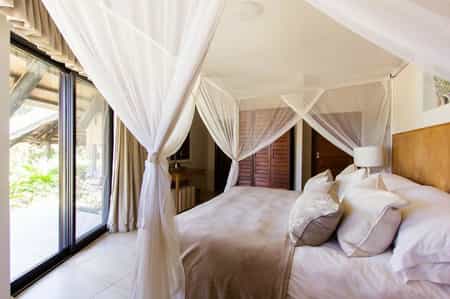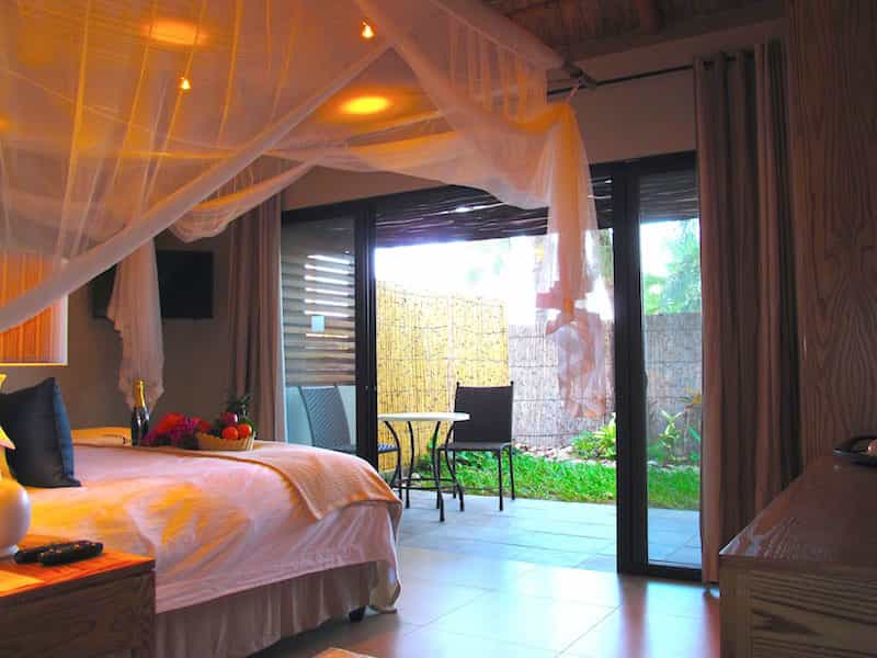 Twelve rooms are spread throughout the grounds. Eight deluxe rooms with large glass sliding doors face the sunrise across a mangrove-lined channel. These are sufficiently roomy inside, and have high peaked ceilings, cool tiled floors, gauzy netted beds, and good en-suite bathrooms. Nearer the beach, three ocean villas have their own private gardens, and en-suite bathrooms with spacious showers. Honeymooners are drawn to the spacious Presidential Suite, with its elegant lounge, romantic outdoor shower, and full en-suite bathroom.