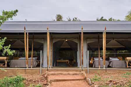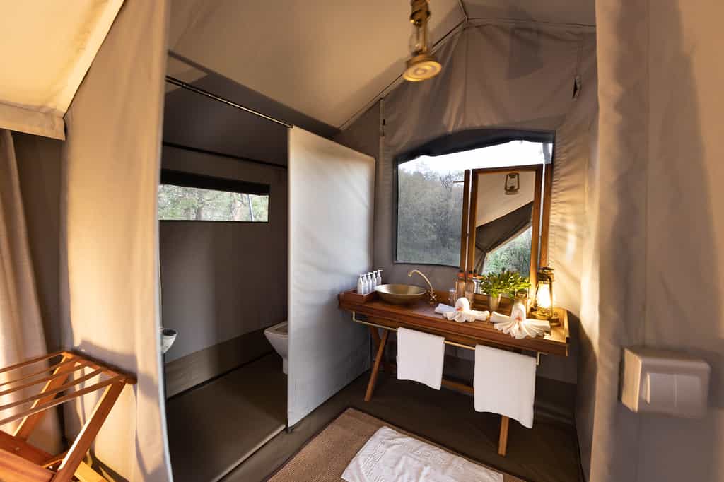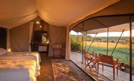 The seven guest tents at Basecamp Wilderness are strategically sited around the rim of the valley to offer both seclusion and sweeping Naboisho Conservancy views. Newly refurbished for superb, authentic safari comfort, each tent offers either a king-size or twin beds, while the separate bathroom tent features eco-friendly bio-flush toilets and the opportunity to experience one of the all-time classic Masai Mara safari experiences, a bucket shower with the water heated on request. Further opportunities to gaze out over the plains are provided by the seating area on the perfect terrace – there is nowhere finer to recline with a book and a pair of binoculars to hand.
