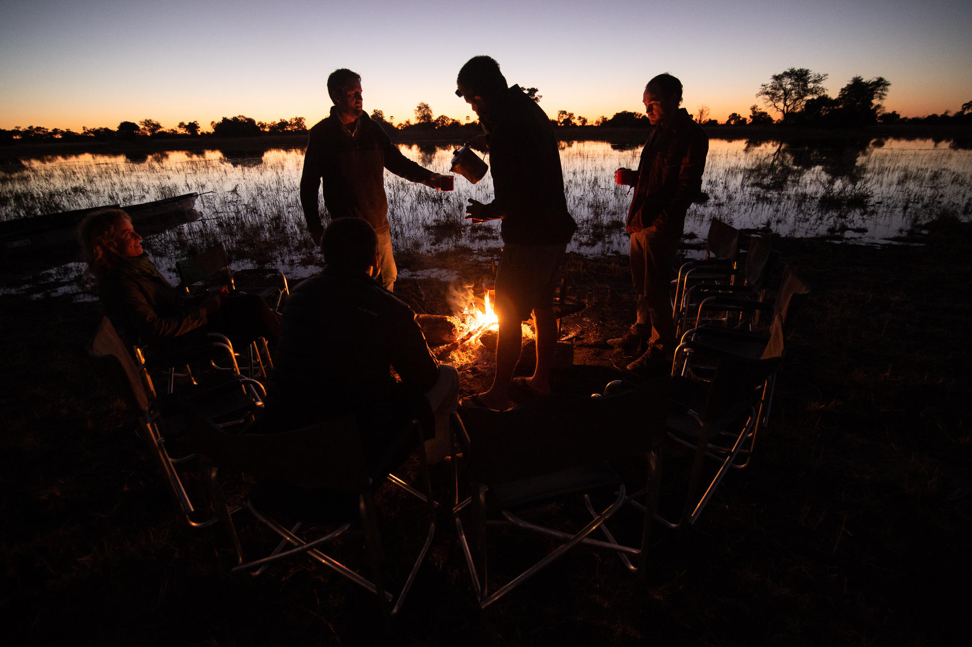 You can trust your guides to find an absolutely magical spot to set up camp. Hidden corners and remote reaches of the Delta are yours to explore! Once the camp is set, you will find an open communal area. For meals, a buffet of miraculously fresh and delicious food is paired with a bar. Dine with your fellow travellers at a communal table, enjoying a friendly and relaxed atmosphere that is enhanced by the tranquil location. At night, gather around the fireplace to reminisce on the day's highlights and bask beneath the blanket of stars.