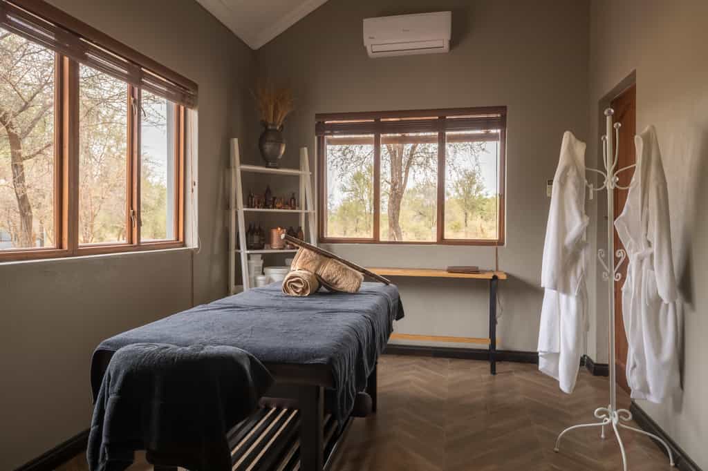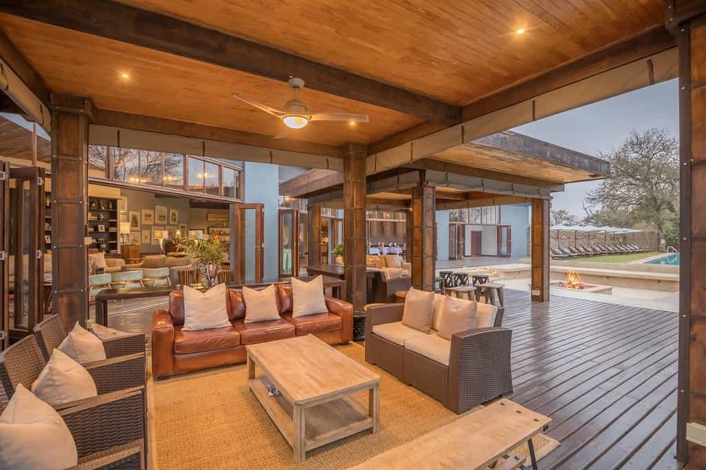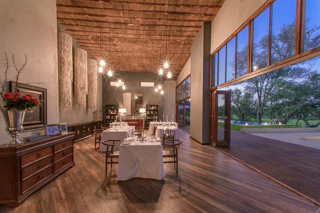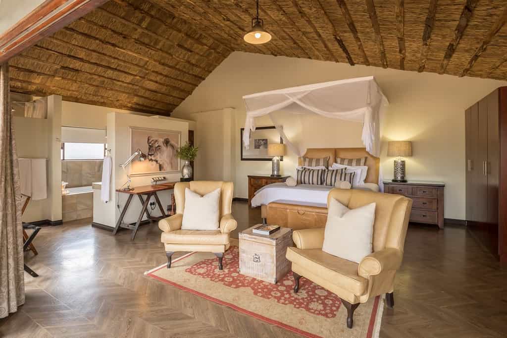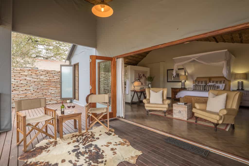 Ten double suites blend contemporary design with the landscape, using steel, locally sourced wood, and plenty of windows to striking effect. With tin roofs that amplify the romance of a rainstorm, the suites overlook either the Makhutsi River or a busy waterhole. King-sized beds with leather headboards, deep mattresses and gauzy mosquito-netting drapes are standard, as is a sitting area and, behind a solid partition, a bathroom with a deep and luxurious tub. A furnished veranda is perfect for wild-watching.