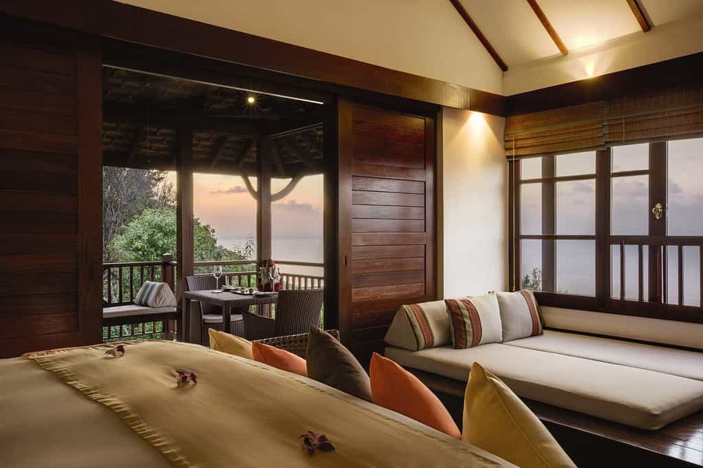 Accommodation consists of 54 villas and 13 private residences, which sleep up to 8 guests and have all the benefits of private accommodation combined with the hotel services. For couples, the villas each have one bedroom, plus space for one to two children, and interiors are whitewashed, teak-floored and supremely lovely. All villas have sea views and spacious outdoor decks from which to gaze at them from, whilst some even have their own massage salas and spa gardens.