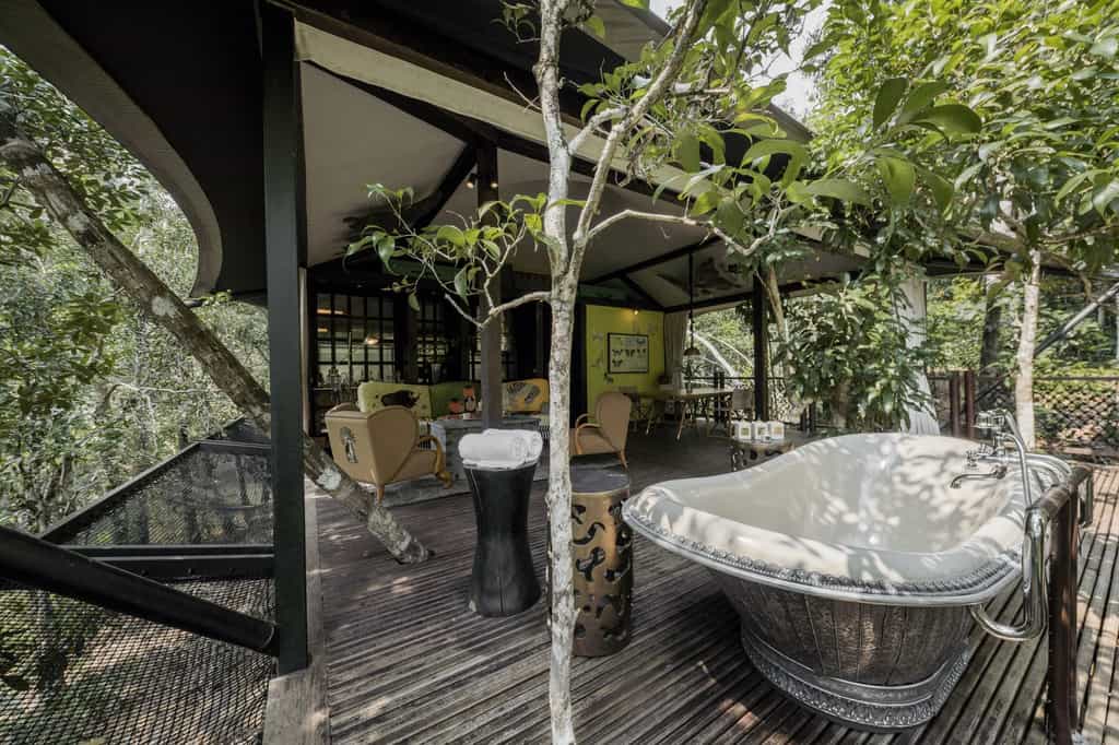 It comes as no surprise that activities are not in short supply. Hike into acres of thick forest to spy a pillated gibbon, and plenty of butterfly and birdlife. Take a trip down the river on a pontoon-style boat (with a bar and spa treatments), which can drop anchor for spontaneous kayaking anywhere you fancy including sundowners on a stone island. Go mountain biking down rugged trails, monitor endangered species with the resident naturalist or see the park from the air on a ziplining expedition (with the reward of a G&T at the end).