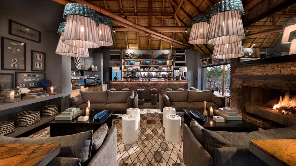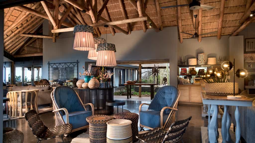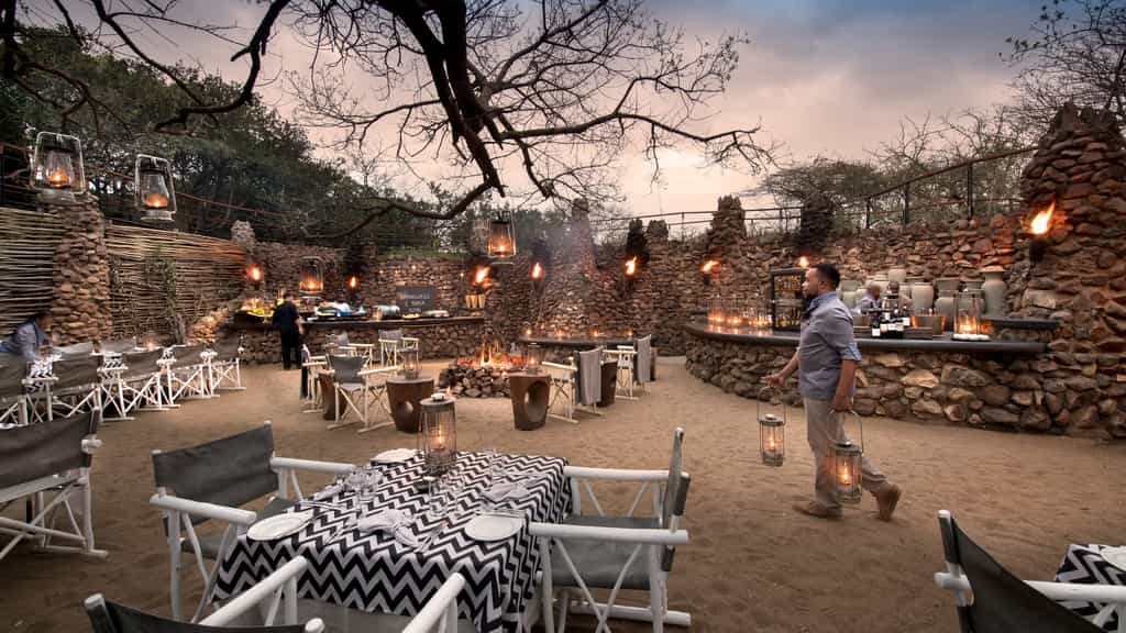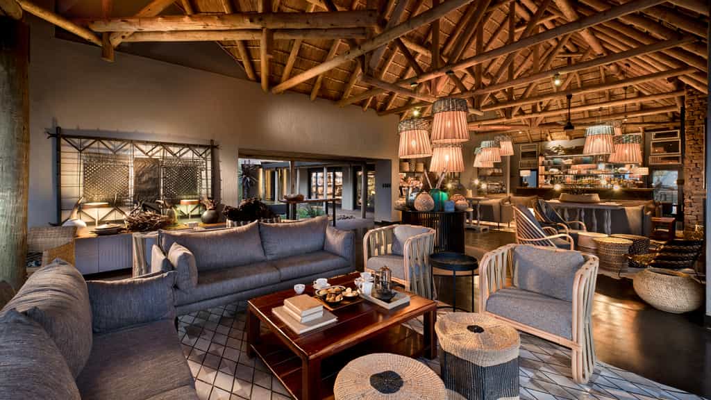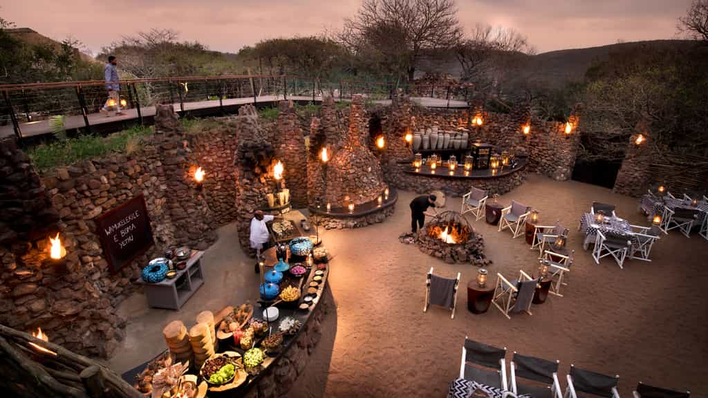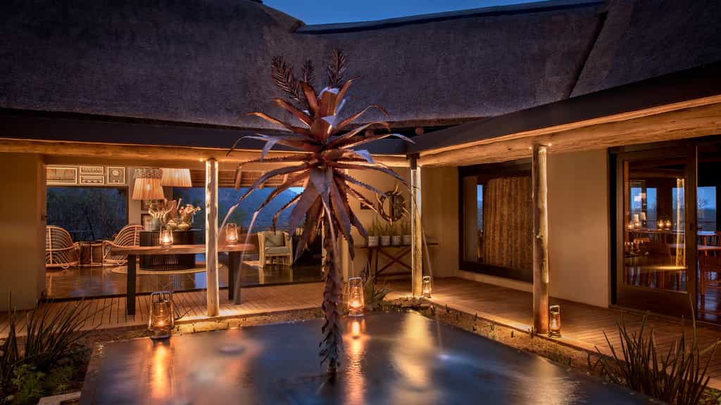 Mountain Lodge's guest area is an open-plan, U-shaped building with a central courtyard that offers views across the bush and comfortable seating so you can relax after game drives or meals. In fact, the lodge is dotted with inviting seating areas both indoors and out. You can dine inside, on the deck overlooking the mountains or in the candle- and lantern-lit boma, under the stars (the menu is chalked on a board in the main courtyard before every meal).
