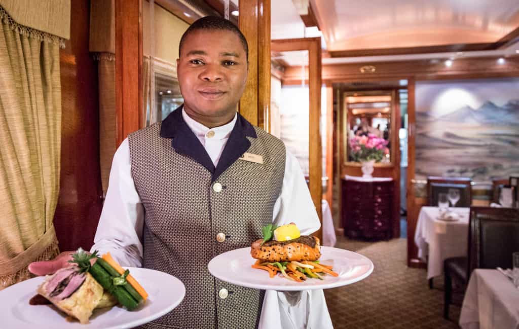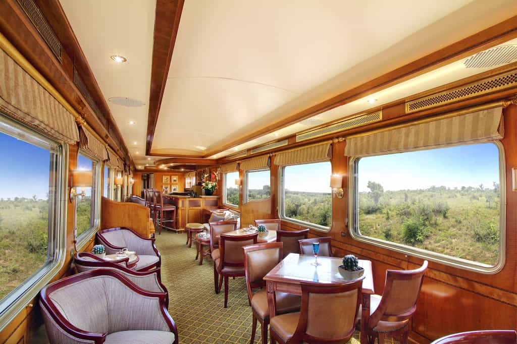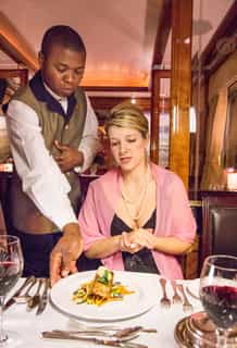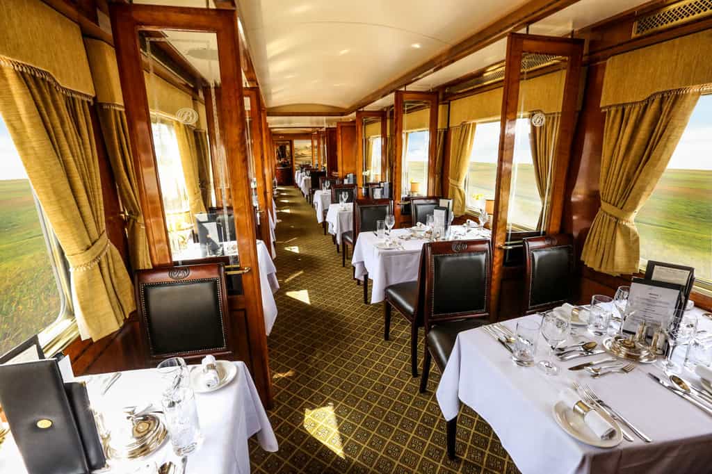 The Club Car and Lounge Car are supremely comfortable settings for leisure time. The Club Car resembles a sophisticated gentlemen's club, with leather chairs, gleaming wood panels, bookshelves and fabulous views on three sides. The Lounge Car is a bright space, decorated with local artwork. Here you'll enjoy the refined ritual of high tea, or a post-dinner digestif. Meals are served in the dining car, with its elegant decor and candlelit evenings. And there's a boutique for those precious mementos.
