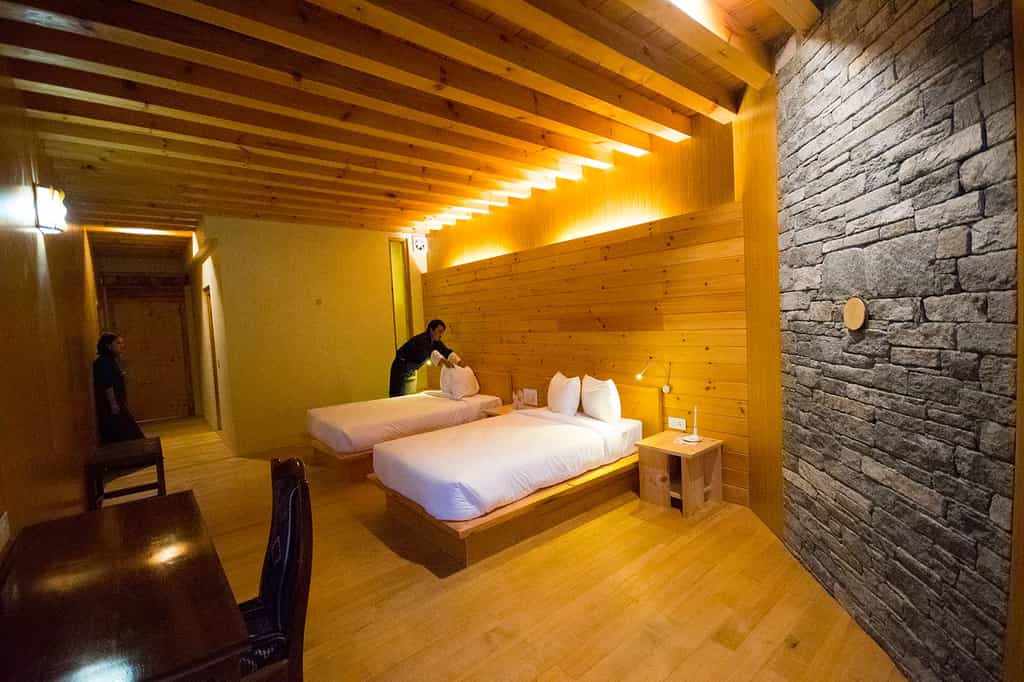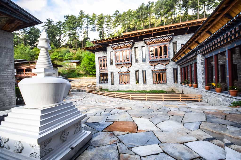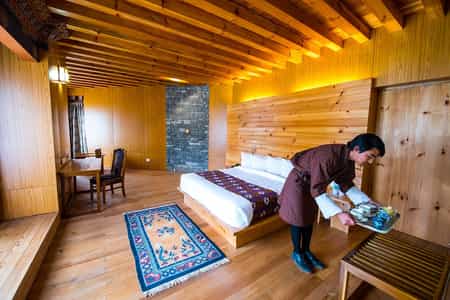 Built in a traditional Bhutanese style with stone walls and pretty, painted gables, the main areas are charming and comfortable. On chilly evenings, the roaring fire in the lobby beckons enticingly, whilst the restaurant serves meals showcasing Bumthang's local treasures – buckwheat pancakes with honey, fibre-rich puta noodles, and farm-fresh cheese. The bar is well-stocked for evening tipples and the pleasant gardens offer plenty of space to decompress. And don't forget the rooftop hot stone baths – choose open-air soaks to gaze at the valley or indoor options for more privacy.