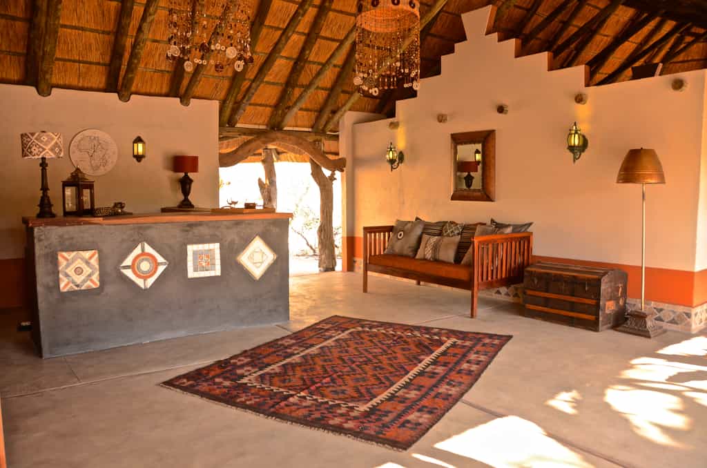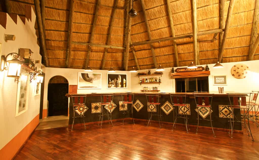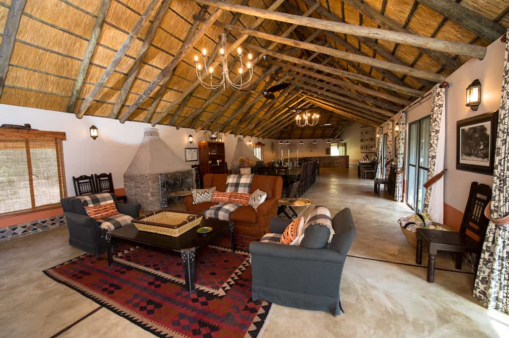 The large crescent-shaped thatched structure of the main area hugs an expansive outdoor patio, in the centre of which is a large camel thorn. Meals are often served here in the shade of the tree. The open-sided thatched room houses a large bar with wooden countertop and several comfortable sofas and seating areas. The decor is simple with dark wood, iron and touches of African art.