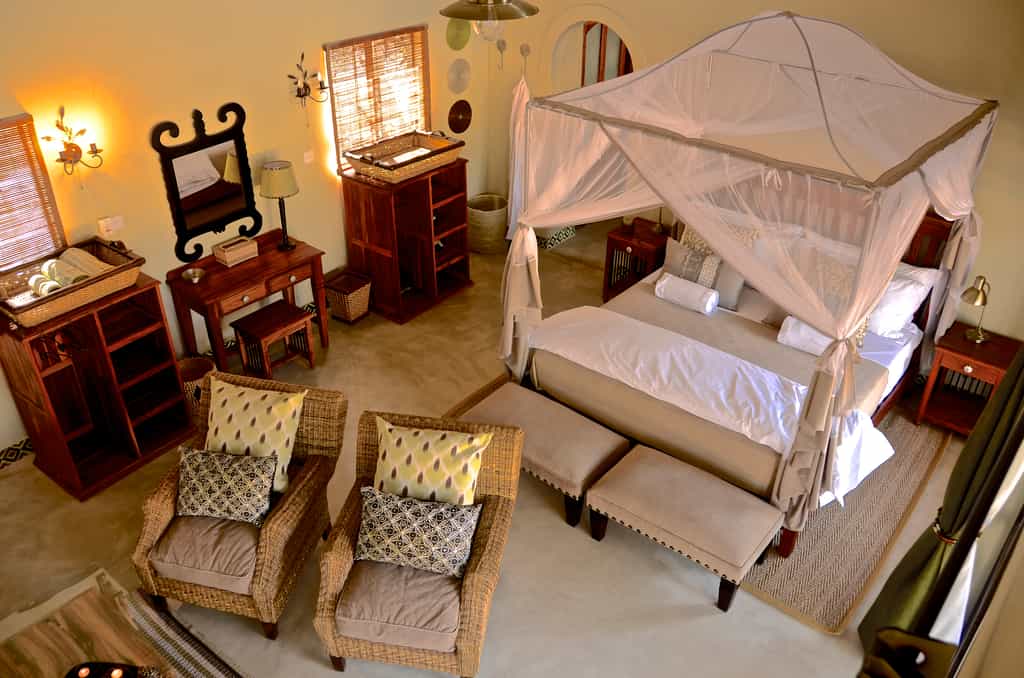 There are eight double-sleeping forest villas, each with a patio and a spiral staircase that leads to a shaded upper-deck game viewing area, furnished with a daybed - perfect for an afternoon nap. The structures are concrete and stone and feel more hotel-like than a bush camp. All the amenities are accounted for: an ensuite bathroom with shower and bath; a fireplace; plenty of light and a safe to secure your belongings. The surrounding woodlands ensure adequate privacy and the free-standing hammock is a lovely touch.