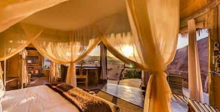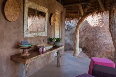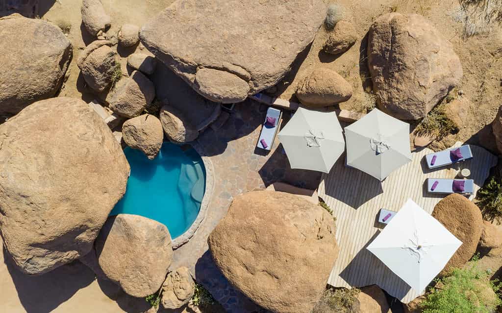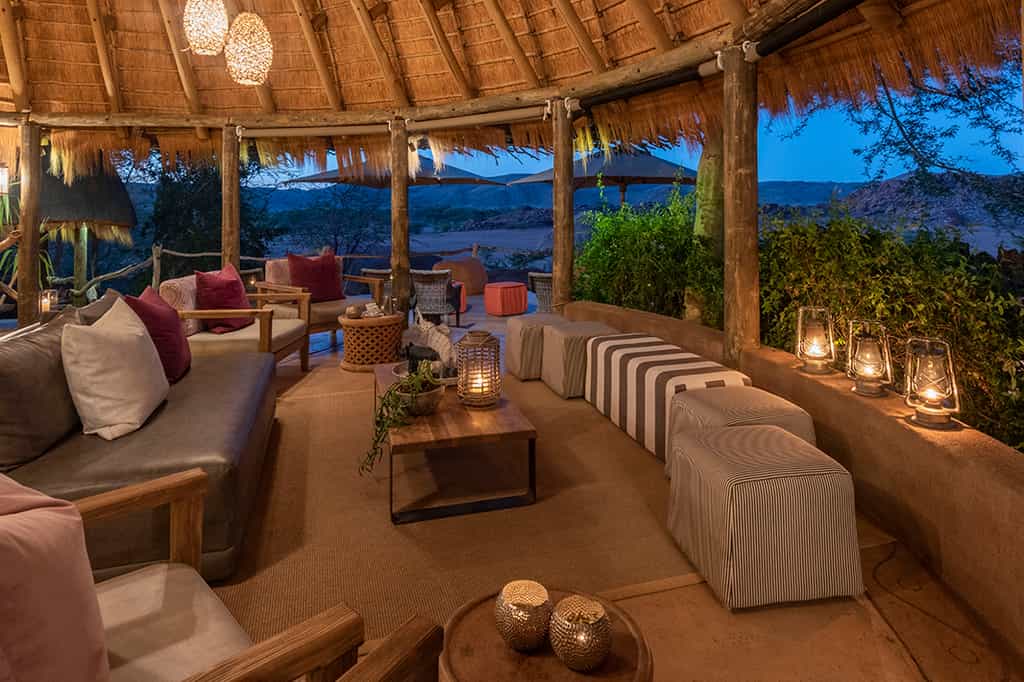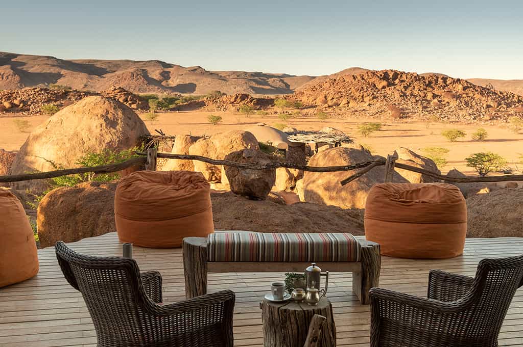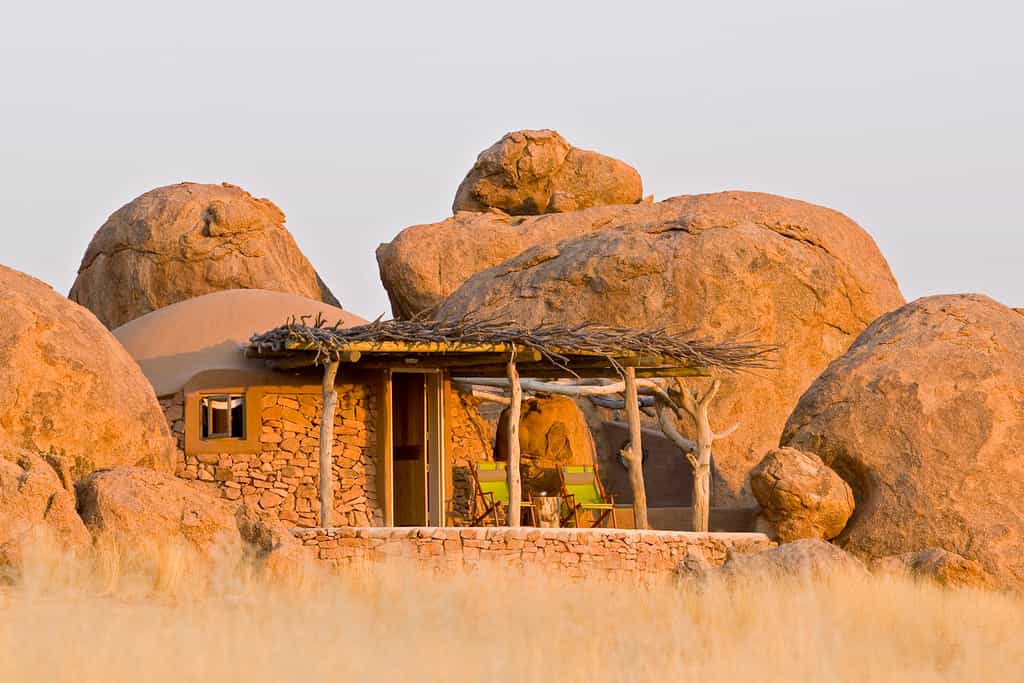 The 10 thatched, dome-roofed bungalows are simple but extremely comfortable, each with an outside shower and tub (your privacy is ensured). They are private, elegantly furnished and extremely quiet with excellent views of the surrounding scenery and wildlife. There is standard power with a generator backup, but no wi-fi. Deck chairs on the porch offer private views across the boulder-strewn desert.