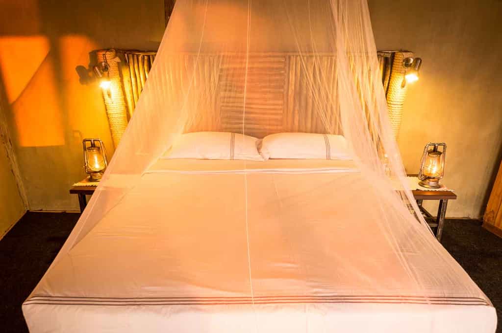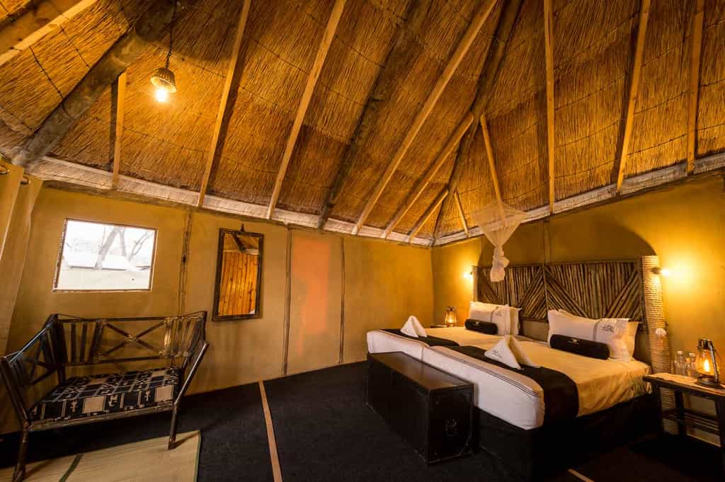 Five rounded canvas tents, including one honeymoon tent, are built on slightly raised wooden decks along the edge of the lagoon. Double or twin beds draped with mosquito nets fill most of the space, with the rest taken up with an en-suite bathroom furnished with basin, toilet and outdoor shower (honeymooners also have a tub). Air-conditioning is most welcome, since it can get extremely hot in September/October, and extra blankets are provided for warmth in June/July.