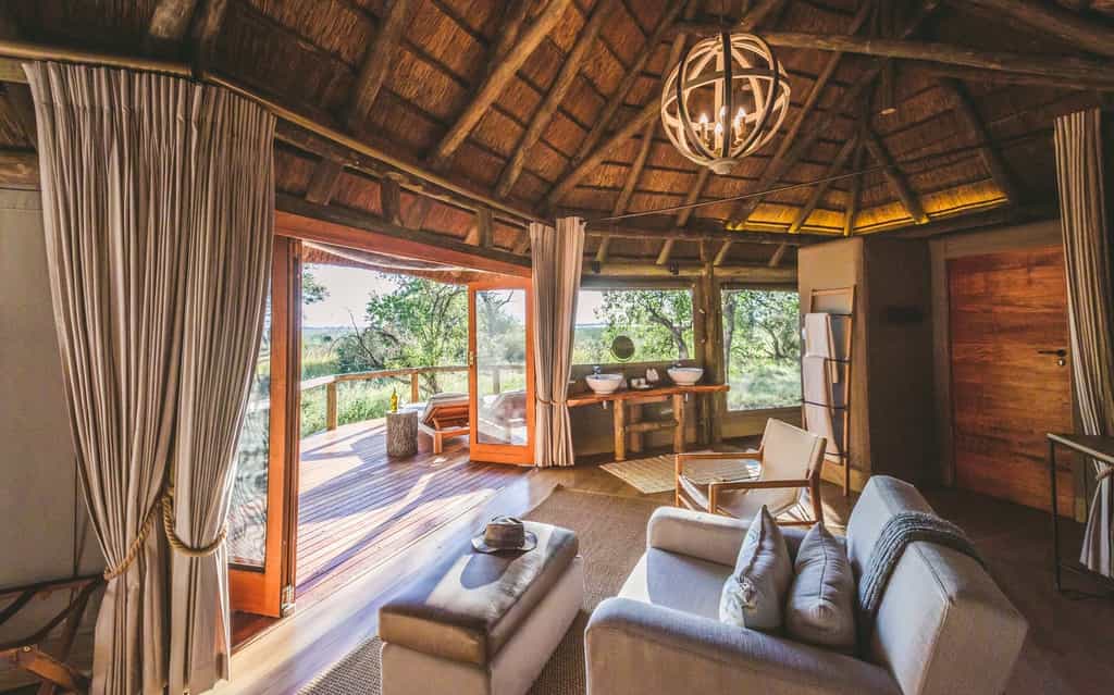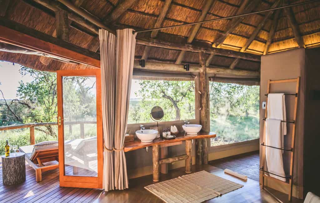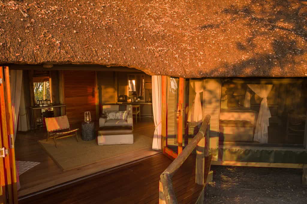 There are 12 Meru-style tents, including one family unit, each built on raised teak decks. Each has it's own en-suite bathroom with a shower, flush toilet and vanity area. Large woven mats give the bedrooms a homely feel, and the four-poster beds, draped with mosquito nets, add a touch of elegance. The rooms extend onto their own small private decks, surrounded by a woodland of mopane, jackalberries and sycamore figs, where you can sit and enjoy the views and the birdlife in the canopy around you.