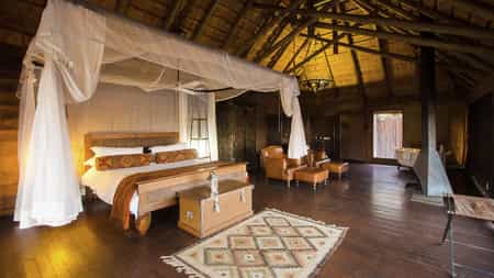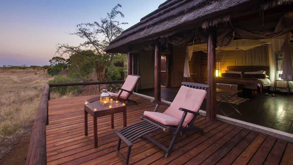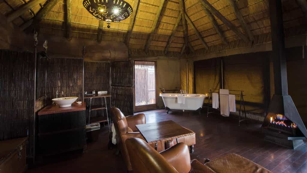 Camp Shawu accommodates guests in 5 spacious tented suites with views over a dam that attracts lots of wildlife. The suites have authentic buffalo dung walls with colonial inspired interiors. They are equipped with a romantic bathtub, a sitting area facing an open fireplace, ceiling fans and an outside shower. A screen separates the bathroom from the bedroom section in Victorian style. A large verandah with reclining chairs and an umbrella provides the perfect spot to watch the game.