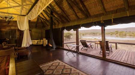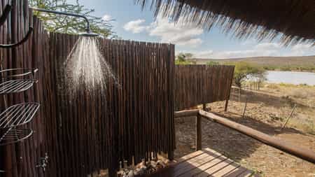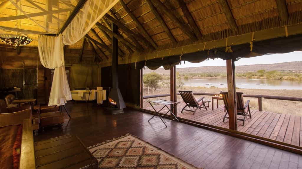 Camp Shawu's front deck is right at the edge of a watering hole where big game viewing, and prolific birdlife, is guaranteed at any time of the day. The main lodge has a charming lounge, a restaurant, and a plunge pool. Meals are served in the indoor dining area in cold weather or at the outdoor dining area on the deck in warmer weather. Planked walkways link the tented suites.