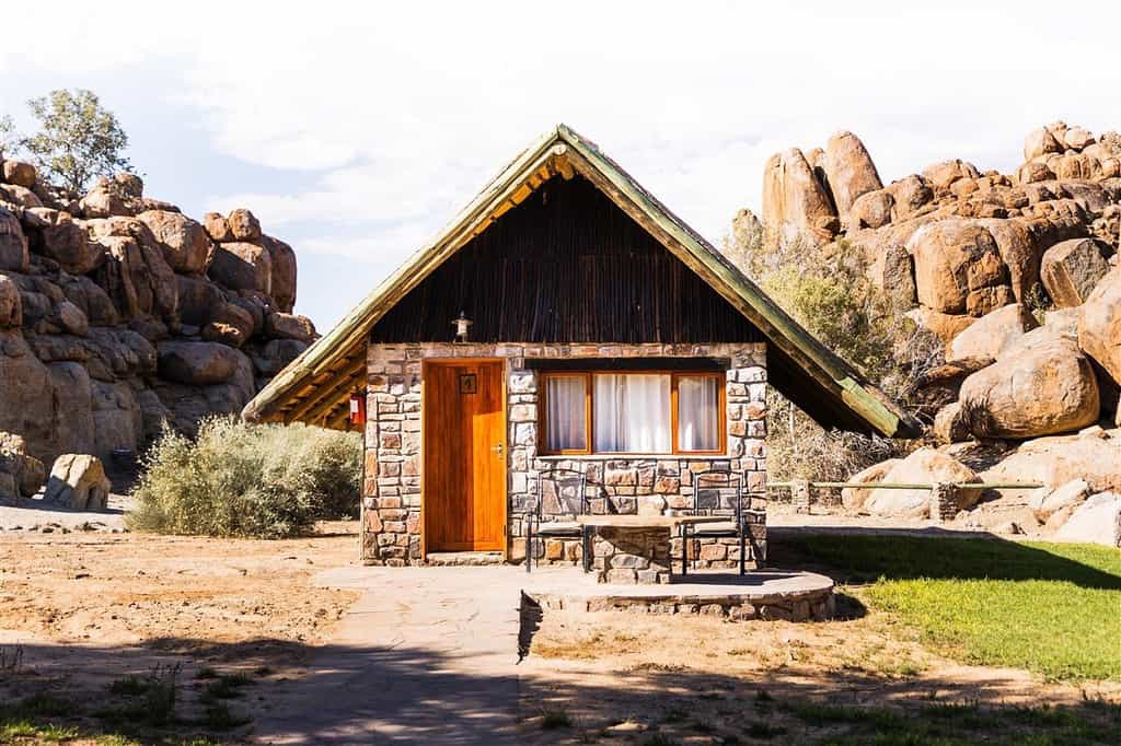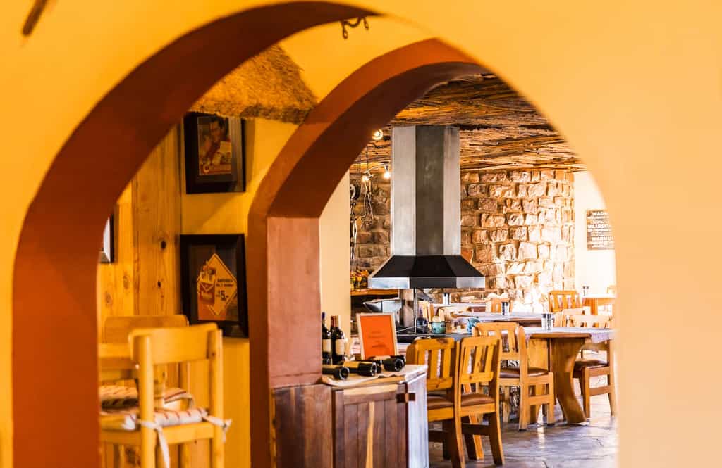 The main lodge is a restored farmhouse, which was built in 1908. Don’t expect anything fancy. There are stone floors, beige walls and some historic memorabilia on the walls, and it’s clean, neat and functional. Here you will find the restaurant with indoor and outdoor dining options, reception, a curio shop, wifi area and bar. The sparkling blue swimming pool overlooking the rugged desert is set away from the lodge, as are the guest rooms.