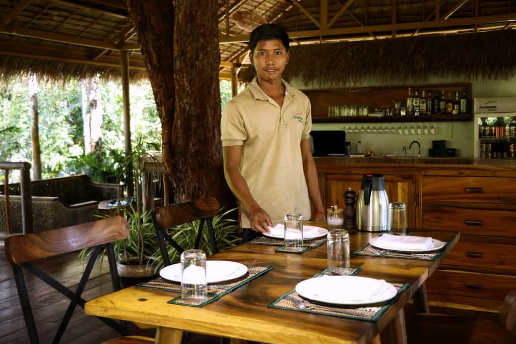 In a natural clearing not far from the softly flowing river, the central thatched restaurant serves a set menu of hearty Khmer dishes (all locally sourced) as the rustles of the forest become your soundtrack. Grab a drink from the facebrick bar and sit out on the patio as the sun sets and gibbons race through the trees on the river bank.