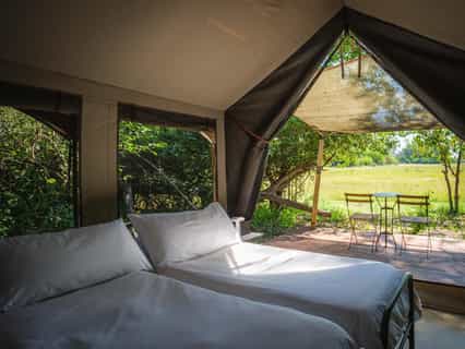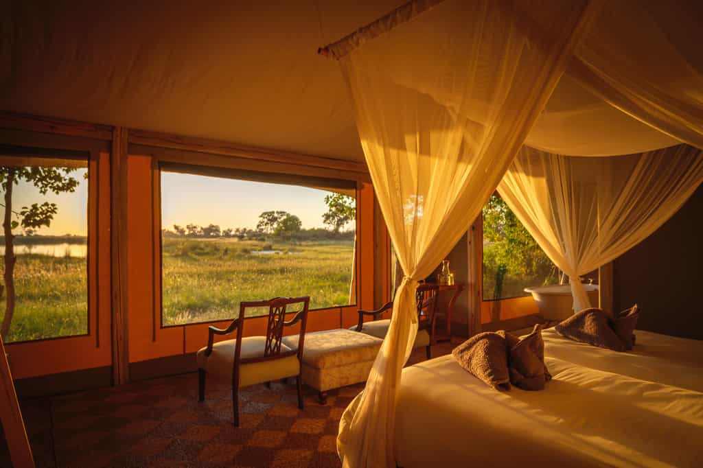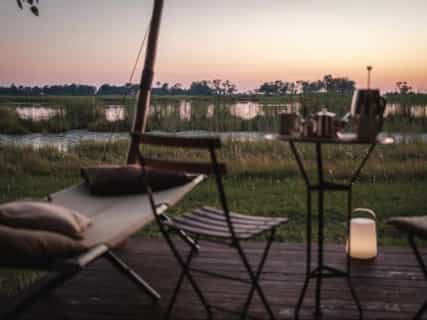Cha Cha Metsi Camp offers an intimate safari experience for up to 12 guests. The camp features 6 canvas tents with ensuite bathrooms and scenic verandas overlooking a lagoon. Accessible by helicopter or road transfer, the camp invites visitors to immerse in African bush life. Ride Botswana's excellent stable is also based here offering thrilling riding safaris.