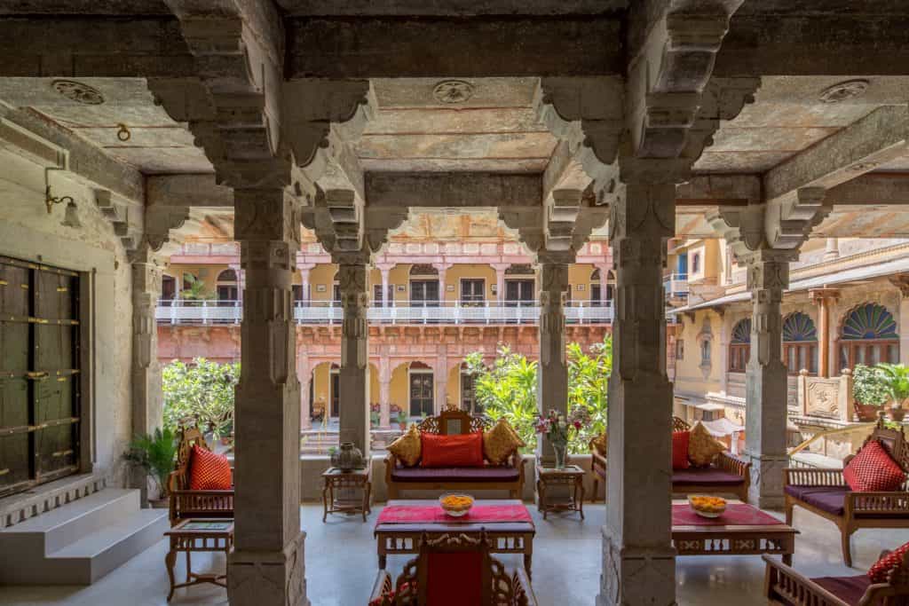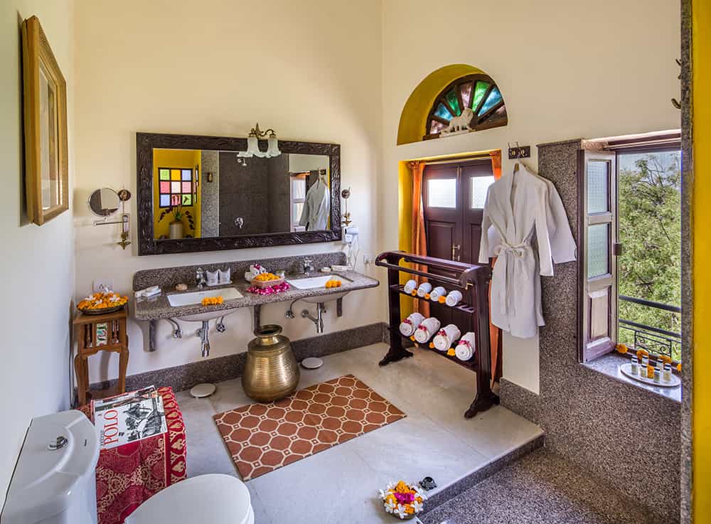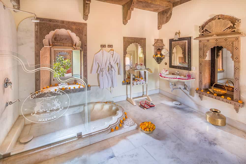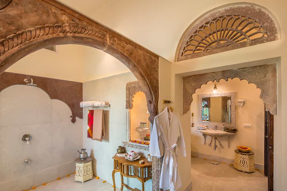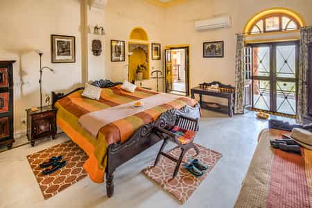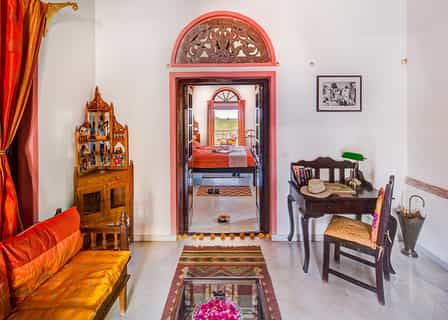 Chanoud has just 10 suites, all decorated in traditional patterns and heirlooms from the family's long history. Each room has an en-suite bathroom decorated in quintessential marble with a walk-in shower; a minibar; desk and sitting area. Scatter cushions, textiles and stained glass windows fill the rooms with bright jewel colours. A selection of rooms also come with semi-private terraces with a cushy day bed. Ornate carved archways and antique furnishings hark back to a bygone era, the vibrancy of Rajasthan echoed in each room.