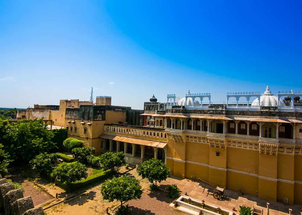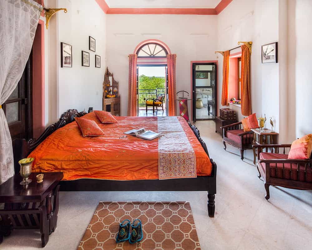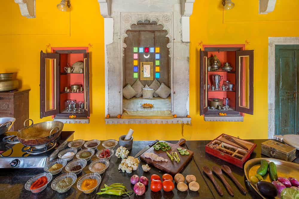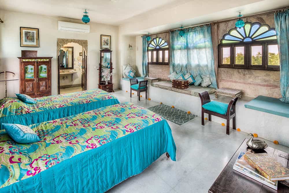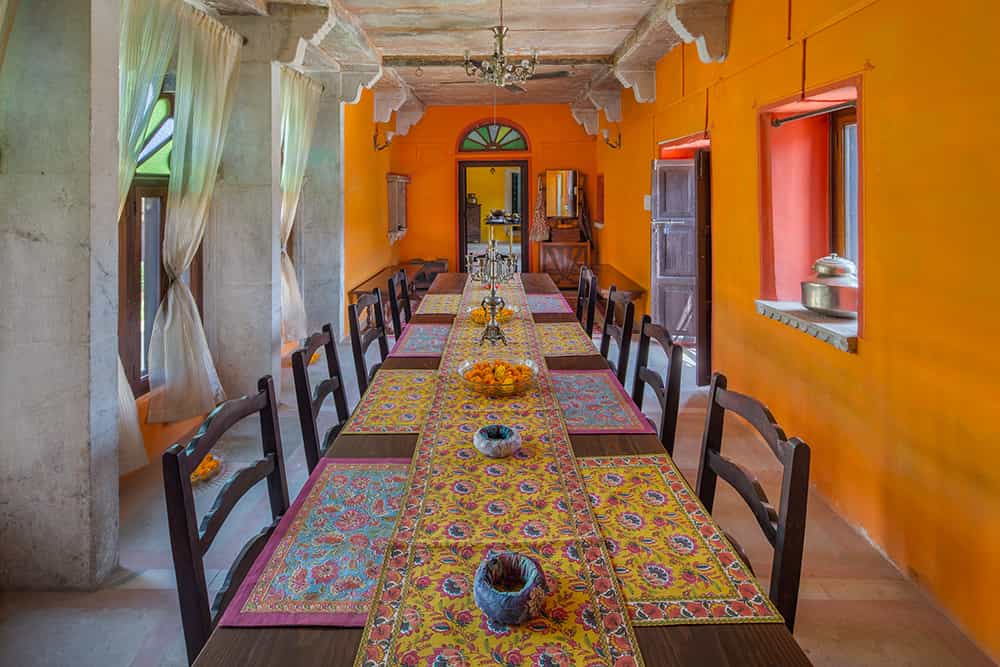 Dining is done in two ways; Moti Mahal is Chanoud's main daytime dining area and in summer, dinner is candlelit on the rooftop; and Mor Chowk is for wintertime dining by the warmth of a crackling fire. Your meals are prepared from the family recipe book and include the home specialty, chakki ki sabzi, a Rajasthani curry. Although there is no pool, there are plenty of cosy jharokhas and wrap-around verandas overlooking a central courtyard, which makes for a lovely sunny spot to relax on wicker chairs.
