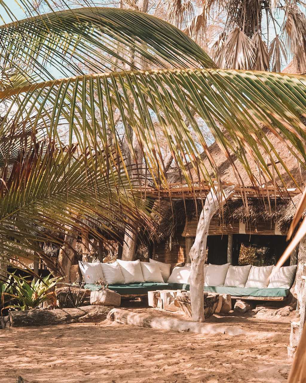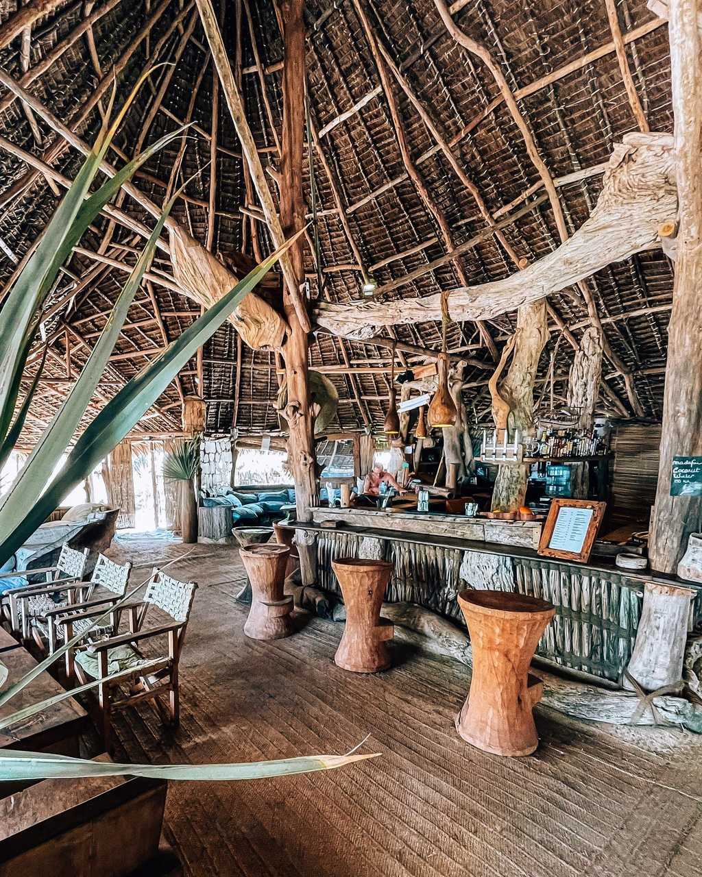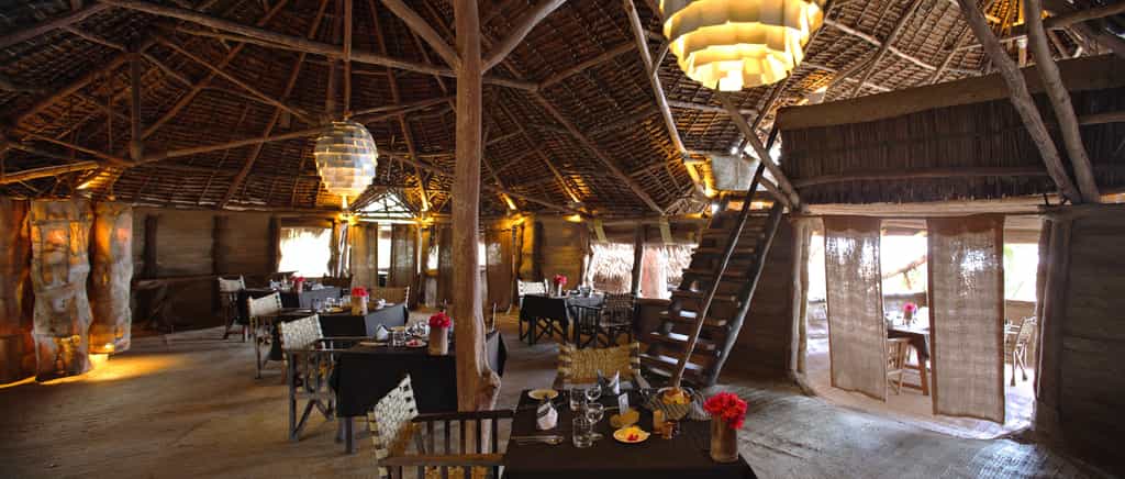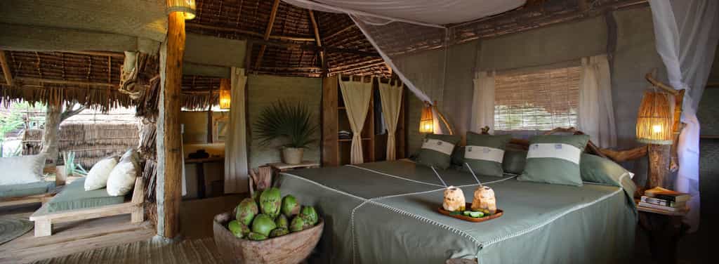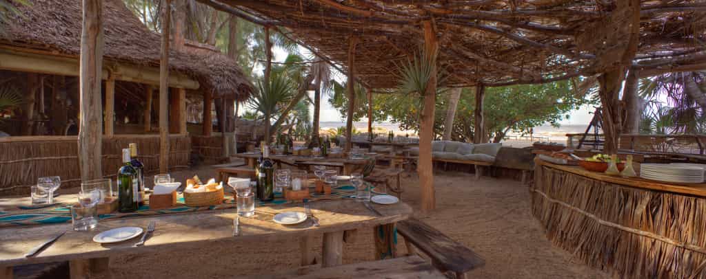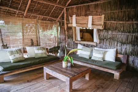 A sandy track leads through the dunes to the reception area and huge lounge bar and restaurant under a shady palm-leaf roof. Above, a loft with scattered floor cushions provides a quiet spot to relax and take in the fabulous ocean views, and in the evenings the lounge bar springs to life with music sessions and the occasional disco. There’s also a small massage hut, and a beach shop with one-of-a-kind locally made jewellery, crafts and African-style clothing.