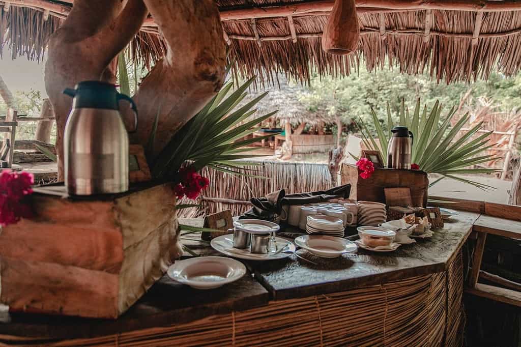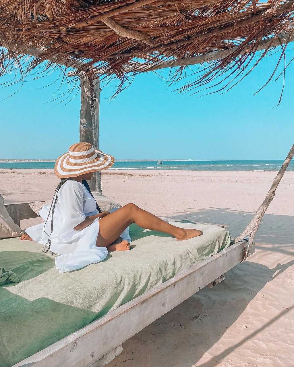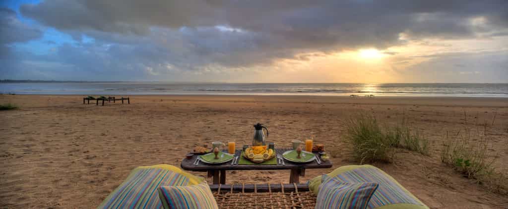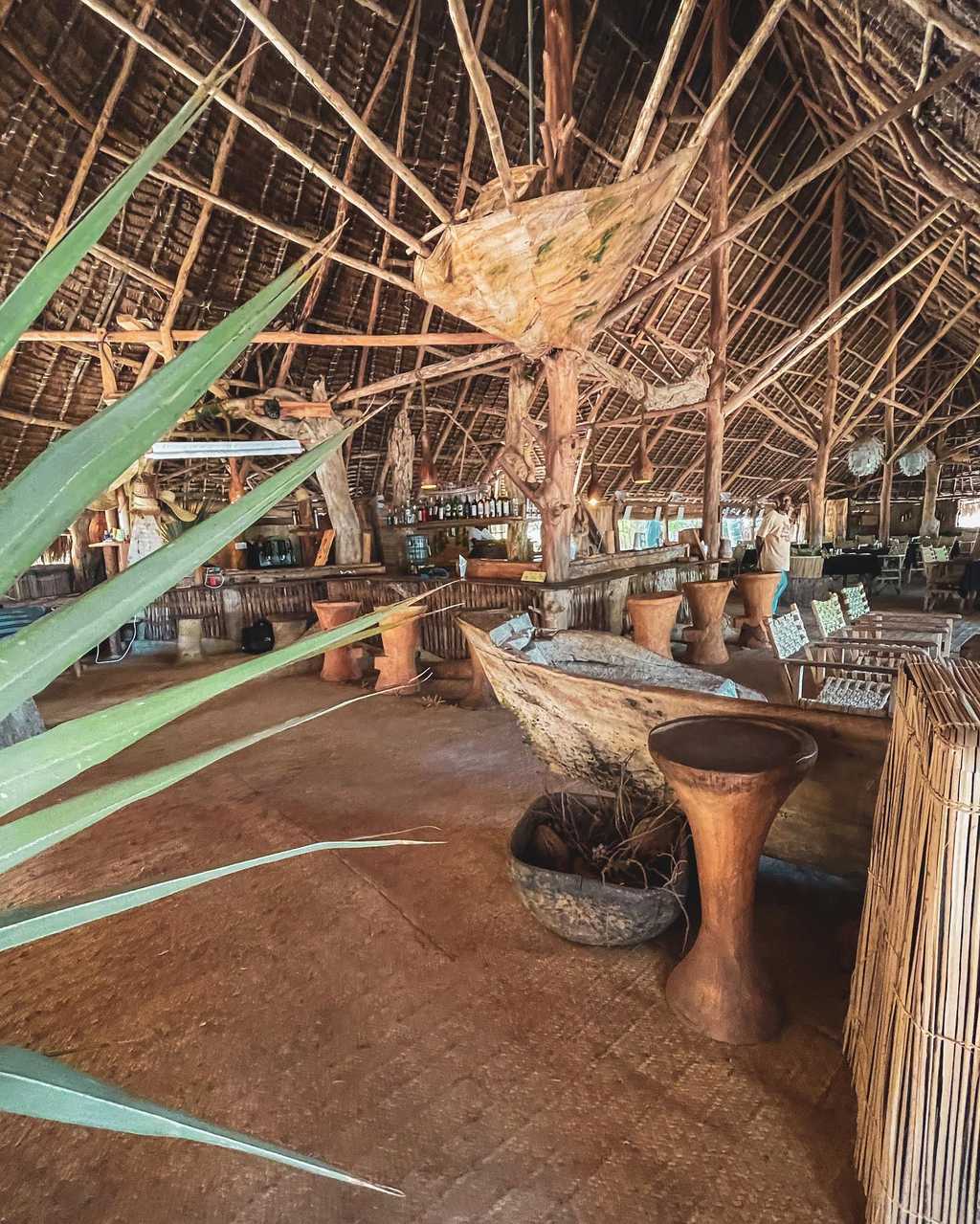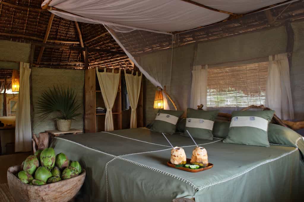 A sandy track leads through the dunes to the reception area and huge lounge bar and restaurant under a shady palm-leaf roof. Above, a loft with scattered floor cushions provides a quiet spot to relax and take in the fabulous ocean views, and in the evenings the lounge bar springs to life with music sessions and the occasional disco. There’s also a small massage hut, and a beach shop with one-of-a-kind locally made jewellery, crafts and African-style clothing.