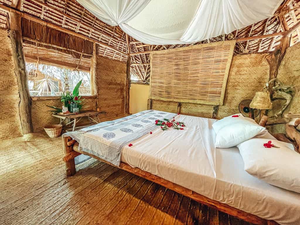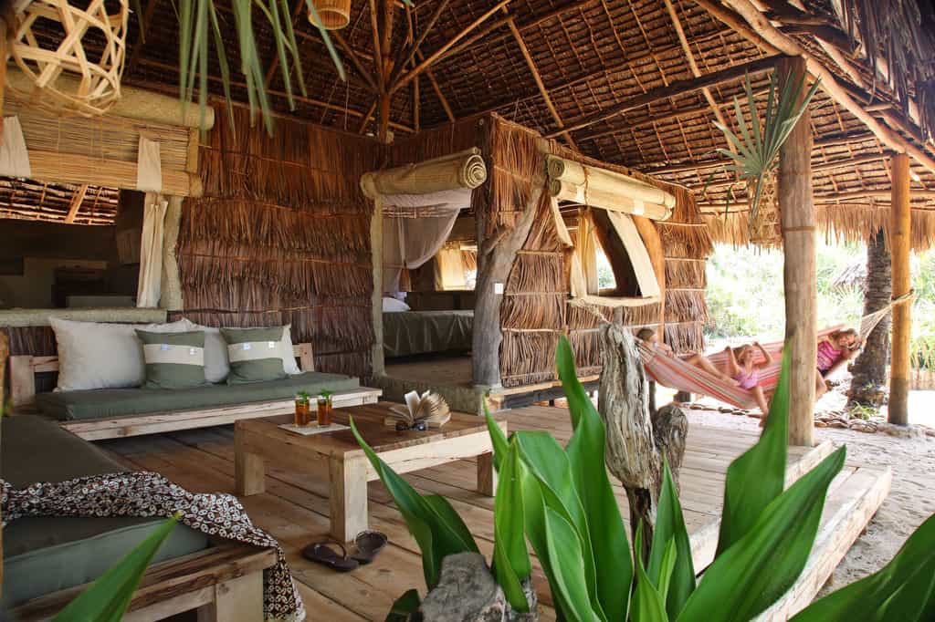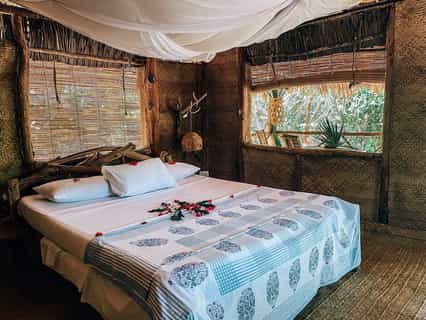 Nine en-suite rustic beach bandas offer comfortable island-style accommodation. The units range in size from doubles to a triple, two family bandas and two larger luxury suites, all with a delightful castaway-chic appeal. Charming natural interiors have soft woven palm mats underfoot, beautiful handmade driftwood furniture, cane loungers and quirky designer fittings. Bathrooms are en-suite and open to the sky. Further along the beach are several very basic backpacker-style huts with shared bathroom facilities – a great budget option.