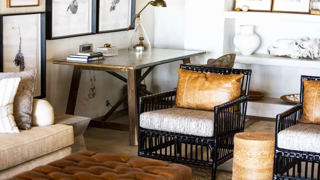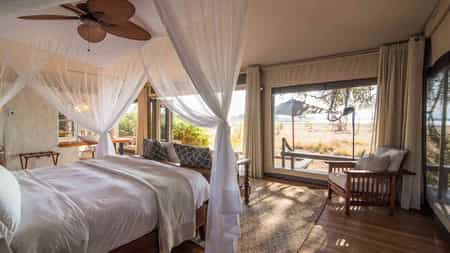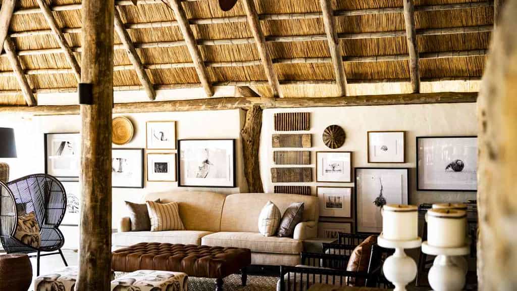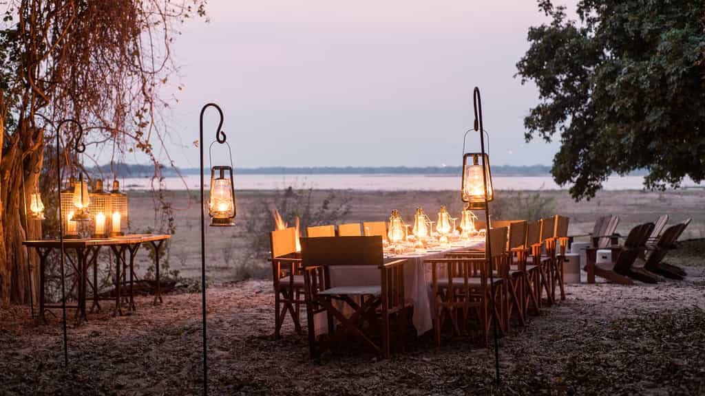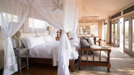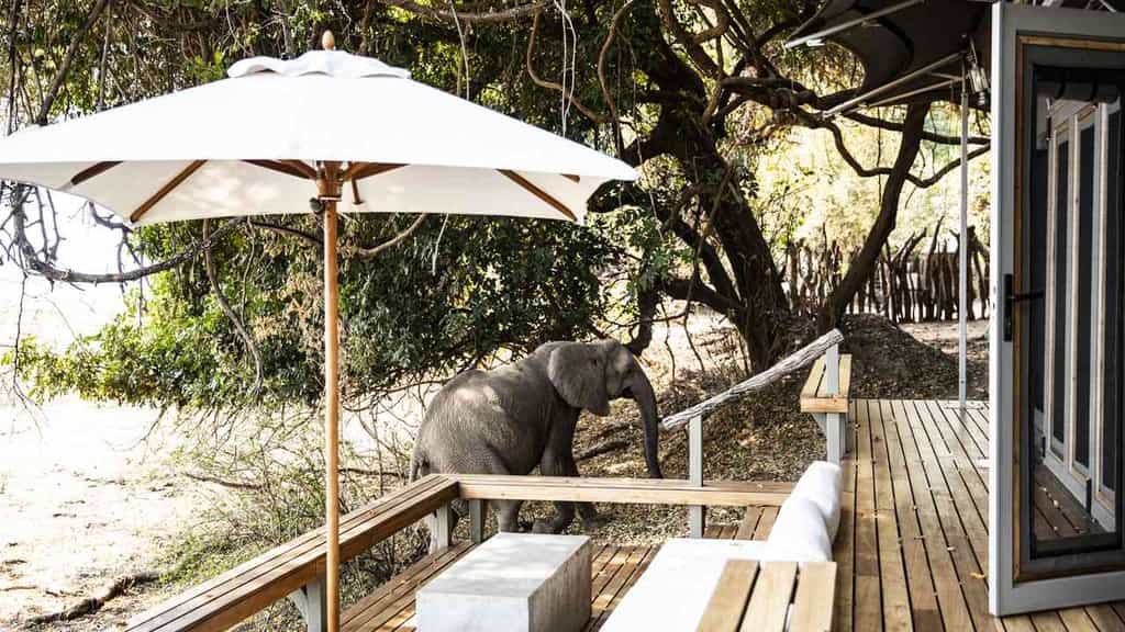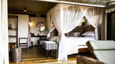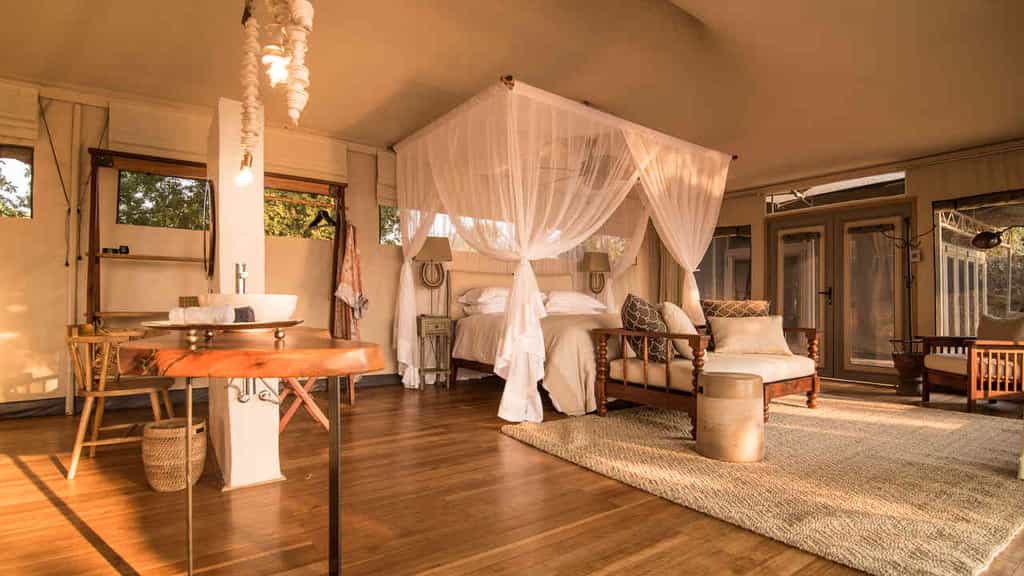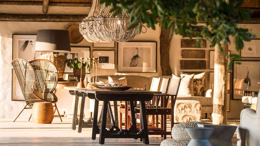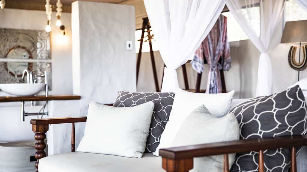 The main area sits under elegant stretched canvas on an elevated deck. Fold-up sides allow the breeze to flow freely, and wildlife viewing is ever-possible. In the lounge, cushioned sofas and chaises have been arranged in a few intimate settings, begging you to sprawl. The dining room, with its long table, is where guests gather to chat and share meals. (Romantic tables for two can also be arranged.) Pull up a stool at the hardwood bar – designed for lingering.